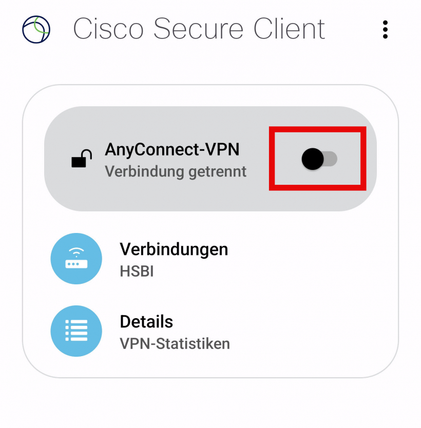5. Navigieren Sie, durch drücken der Pfeiltaste oben links, zurück zum Start der App. Aktivieren Sie die Verbindung, in dem Sie den Schalter bei AnyConnect-VPN per Klick nach rechts schieben.