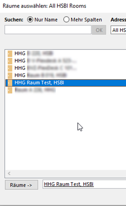 Es öffnet sich die Liste aller beplanbaren Räume, wählen Sie den gewünschten Raum aus und führen Sie einen Doppelklick auf den Raum durch. Wieder holen Sie dies für alle benötigten Räume und klicken Sie auf