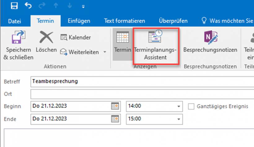 Neu, Neuer Termin aus, um einen Termin mit Raumbuchung zu planen. Es öffnet sich die Maske zum Erstellen eines neuen Termins, füllen Sie den Betreff und wählen Sie die Zeit entsprechend aus.