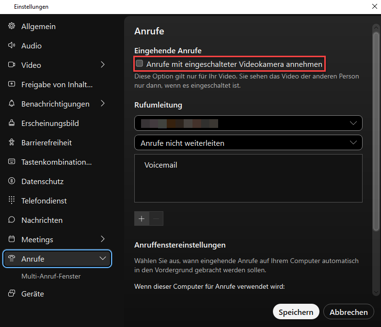 Empfohlene Einstellung: Deaktivieren Sie die Funktion "Anrufe mit eingeschalteter Videokamera annehmen". Die Videofunktion wird somit nur bei Bedarf bei einem Anruf aktiv.