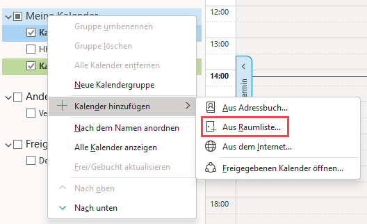 Um einen kompletten Überblick über die Raumbelegung eines Raums zu erhalten, können Sie einen Raum als Kalender einfügen. Im Kalendermodul von Outlook führen Sie einen Rechtsklick auf