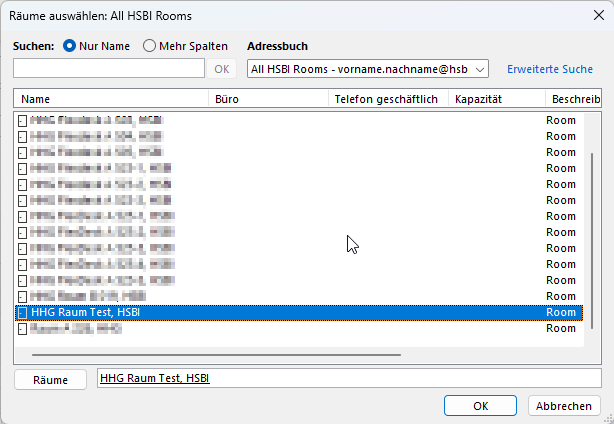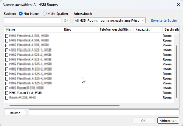 Es öffnet sich die Liste aller beplanbaren Räume, wählen Sie den gewünschten Raum aus und führen Sie einen Doppelklick auf den Raum durch. Wieder holen Sie dies für alle benötigten Räume und klicken Sie auf