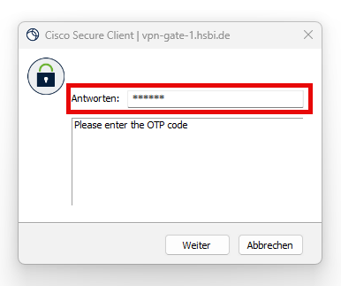3. Nach der Eingabe der HSBI-Kennung müssen Sie jetzt noch das Einmalpasswort aus der entsprechenden 2FA-App oder aus dem OTP-Generator eingeben und auf