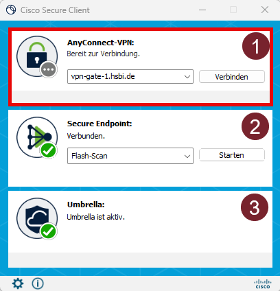 - Der Cisco Secure Client muss zuvor auf Ihrem Gerät installiert worden sein. Für verwaltete Geräte können Sie dies über die Self-Service-Anwendungen installieren. Eine Anleitung dazu finden Sie in unseren FAQs: https://www.hsbi.de/dvz/faq/item/421