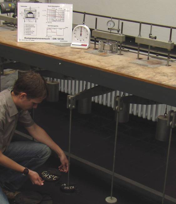 Das Oedometer mit der eingebauten Bodenprobe wird in die Belastungsvorrichtung eingesetzt. Neben der neueren Versuchsanlage, in der der Versuch durch ein Druckluftsystem automatisch gesteuert abläuft, wird auch der ältere, von Hand gesteuerte Versuchsstand verwendet. Infolge einer Hebelkonstruktion wirkt hier die 5-fache Kraft der aufgelegten Gewichte auf die Probe ein.
