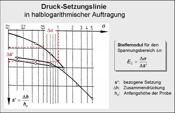 Nach Abschluss des Versuchs wird die Probe ausgebaut, erneut mit dem Ring gewogen und im Trockenschrank getrocknet. Aus dem bekannten Volumen und Gewicht der Probe werden Wassergehalt, Feucht- und Trockendichte sowie der Porenanteil für die Probe vor und nach dem Versuch ermittelt. Die in den einzelnen Laststufen gemessenen Zusammendrückungen Δh werden auf die Anfangshöhe der Probe ha bezogen. Die bezogene Setzung s' wird in Abhängigkeit der Druckspannung σ als Drucksetzungslinie aufgetragen. Der Steifemodul ES wird für Spannungsbereiche ermittelt, die für die Belastungssituation des Bauwerks von Bedeutung sind und für die die Setzungen zu berechnen sind.