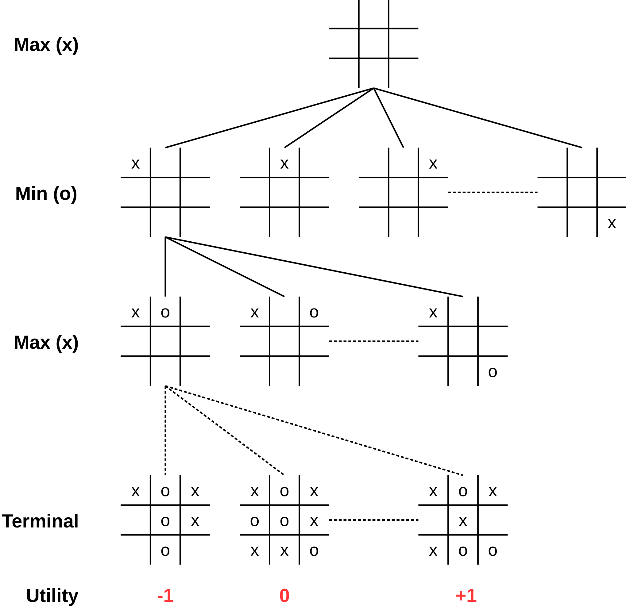 - Minimax: Entwickelt Spielbaum, bewertet Zustände entsprechend