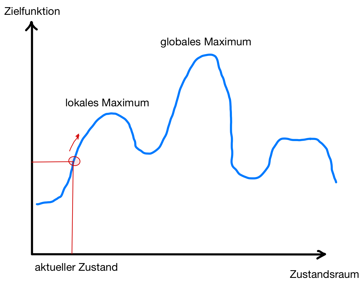- Analogie Bergsteigen: Gehe in Richtung des stärksten Anstiegs der Kostenfunktion => Hill-Climbing