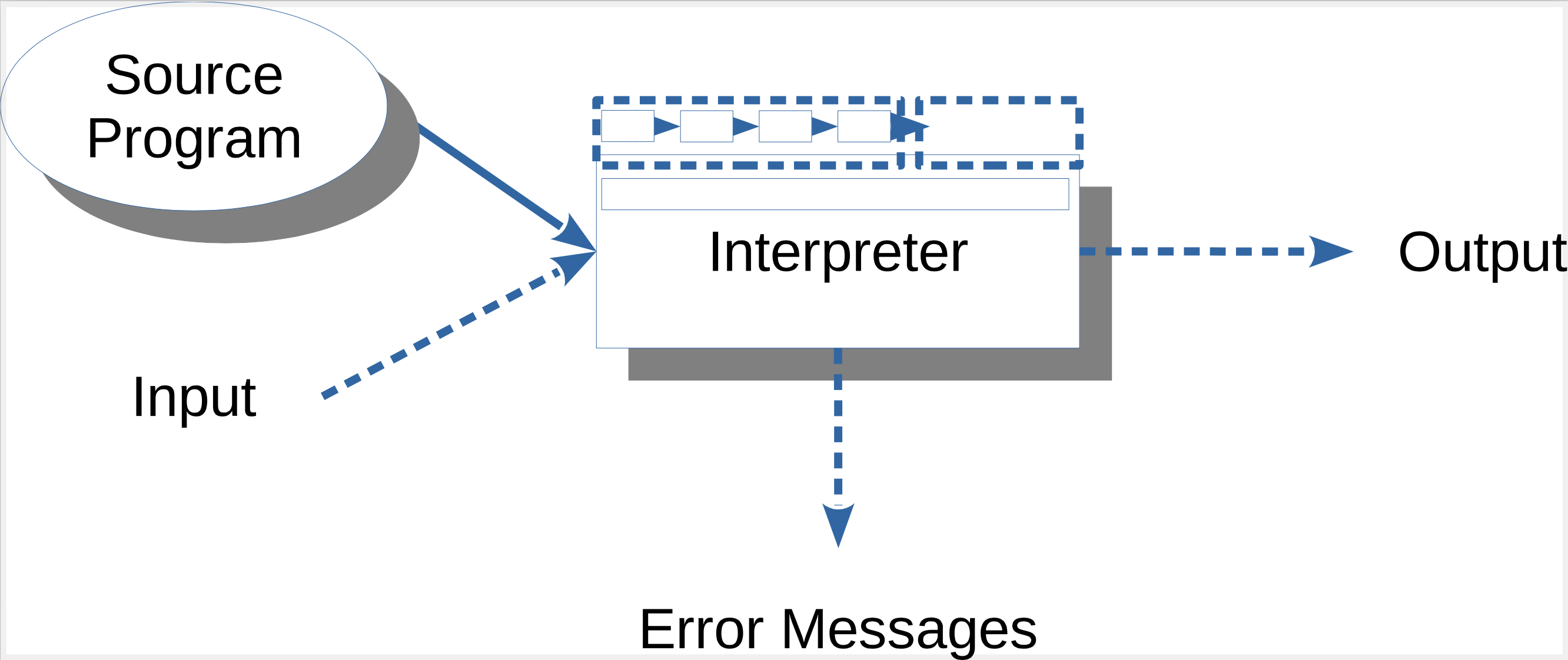 Beim Interpreter durchläuft der Sourcecode nur das Frontend, also die Analyse. Es wird kein Code erzeugt, stattdessen führt der Interpreter die Anweisungen im AST bzw. IC aus. Dazu muss der Interpreter mit den Eingabedaten beschickt werden.