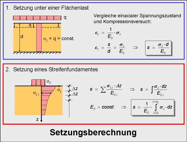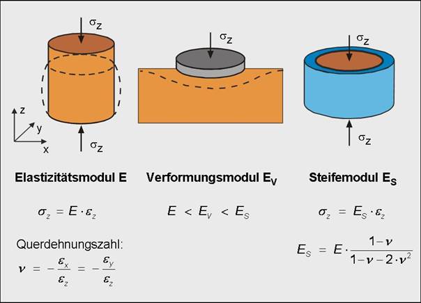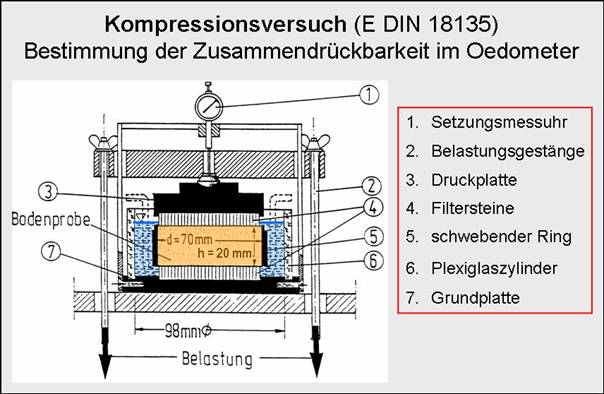 Im eindimensionalen Kompressionsversuch wird eine zylindrische Bodenprobe in Richtung ihrer Achse stufenweise belastet und entlastet. Dieser Versuch wird mit behinderter Seitendehnung durchgeführt, das heißt, die Probe wird nur in der Vertikalen zusammengedrückt. Die Querschnittsfläche der Probe bleibt konstant. Die axialen Verformungen infolge von Belastungsänderungen, Konsolidations- und Schwellvorgängen werden gemessen. Aus der Druck-Setzungskurve wird der Steifemodul ES ermittelt. Der Steifemodul wird als Bodenkennwert in Setzungsberechnungen verwendet.