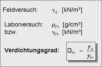 Der Versuch besteht aus mindestens 5 Einzelversuchen, die sich jeweils durch einen anderen Wassergehalt der Bodenprobe voneinander unterscheiden. Als Ergebnis erhält man einen Zusammenhang zwischen dem Wassergehalt w und der Trockendichte ρd, aus dem sich als Maximalwert des Versuchs die Proctordichte ρPr und der zugehörige optimale Wassergehalt wPr bestimmen lassen.