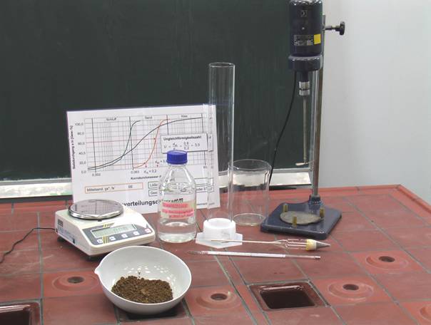 Bestimmung der Korngrößenverteilung durch Sedimentation nach DIN 18123 bzw. DIN EN ISO 17892-4 (Foto der Versuchsgeräte)