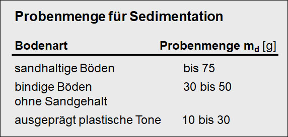 Die Probemenge ist den Bodenarten anzupassen. Die Trockenmasse der Probe kann z.B. durch Probenteilung ermittelt werden. Dabei wird eine doppelt so große Probenmenge mit einheitlichem Wassergehalt verwendet, als für den Schlämmversuch erforderlich ist. Nach Aufteilung in zwei gleiche Hälften wird die eine Hälfte im Ofen zur Bestimmung der Trockenmasse getrocknet. Die andere Hälfte wird für die Schlämmanalyse verwendet.