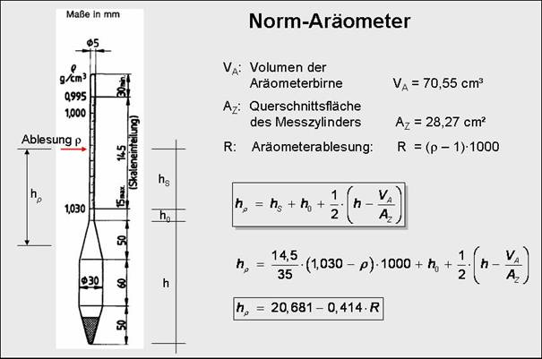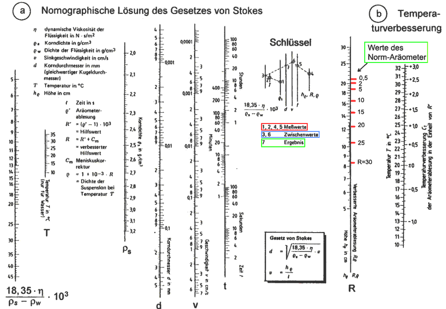 Für die Auswertung müssen noch ein Temperatur-Korrekturwert und ein Korrekturwert für die Aräometerablesung ermittelt werden, da die Ablesung am oberen Rand des Meniskus erfolgt, die Skala aber für den ebenen Wasserspiegel gilt. Die Ablesungen werden tabelliert. In der Tabelle wird auch der "Siebdurchgang" a berechnet. Ein Beispiel für die tabellarische Auswertung ist hier angegeben. Der Korndurchmesser wird mit Hilfe des Nomogramms nach dem Stokesschen Gesetz bestimmt. Vorher muss noch der dem Ablesewert R bzw. ρ entsprechende Wert der Sinkstrecke hρ ermittelt werden. Bei Verwendung des Norm-Aräometers ergibt sich hρ nach folgender Gleichung. Das Ergebnis wird als Kornverteilungskurve in einem Diagramm dargestellt.