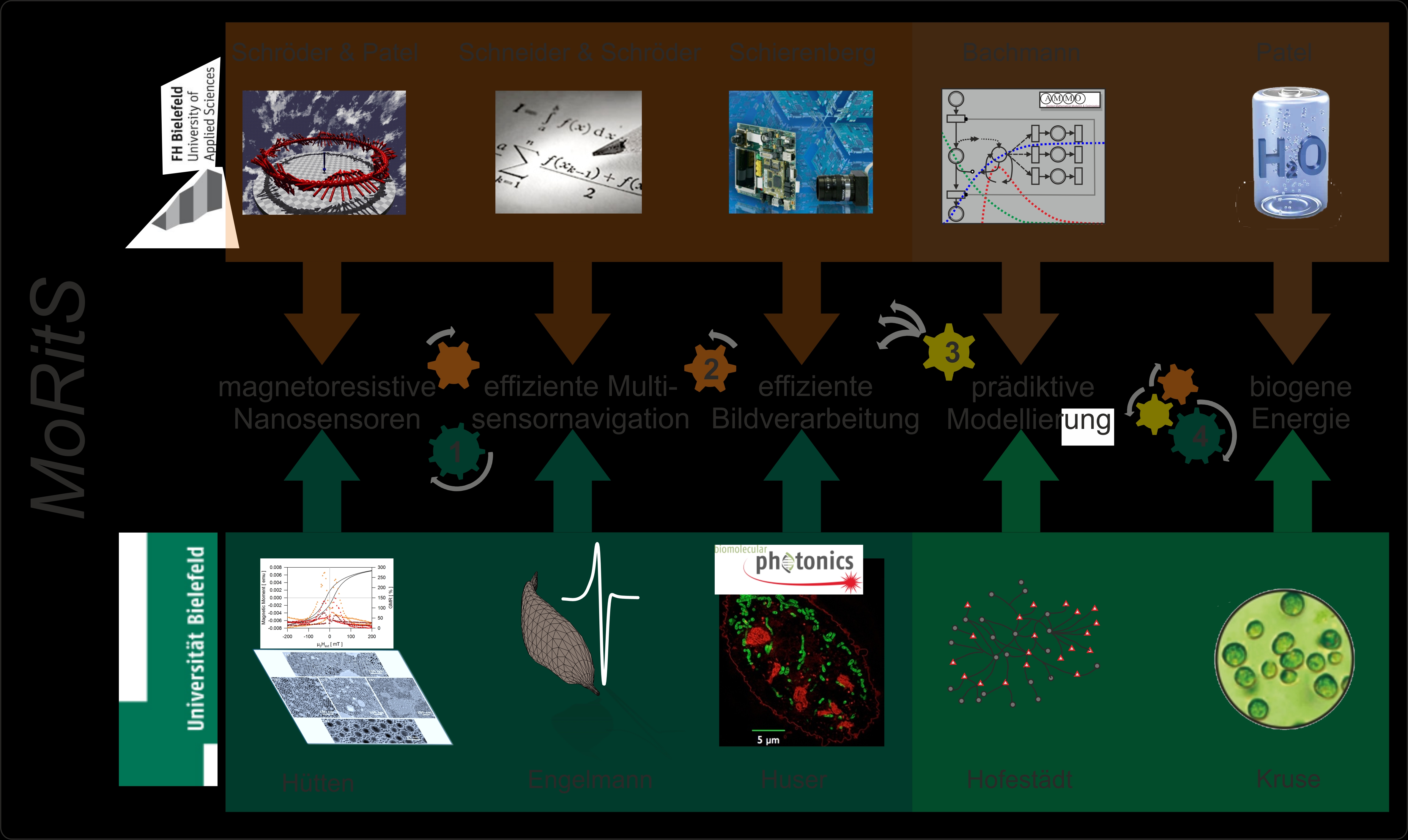 MoRitS ‐ Nachhaltige Forschung unter einem Dach Die Forschungskooperation "Modellbasierte Realisierung intelligenter Systeme in der Nano‐ und Bio‐Technologie (MoRitS)" ist eine Initiative des Fachbereichs Ingenieurwissenschaften und Mathematik (IuM) der Fachhochschule Bielefeld und seiner Kooperationspartner an drei Fakultäten der Universität Bielefeld. Aufbauend auf bestehende und bewährte Forschungspartnerschaften soll innerhalb einer gemeinsamen vielfältig vernetzten und exzellenten Forschungslandschaft qualifizierten Absolventinnen und Absolventen beider Hochschulen die Möglichkeiten zur wissenschaftlichen Weiterentwicklung "unter einem Dach" gegeben werden. Wissenschaftlicher Schwerpunkt der Kooperation ist das zukunftsweisende Thema "Energie‐ und Ressourceneffizienz",speziell im Kontext nano‐ und bio‐technologischer Systeme. Ausgehend von der effizienten Nutzung neuartiger, sensorischer Informationskanäle, über die optimale Informationsverarbeitung in biomedizinischen Systemen, bis hin zur Erschließung biogener Energiequellen bietet unsere Kooperation einen einzigartigen Forschungsansatz, der sich durch eine starke Vernetzung der individuellen Kompetenzen der Kooperationspartner auszeichnet. Mit diesem wissenschaftlichen Ansatz wollen wir auf dem Weg zu einer nachhaltigen Gesellschaft neue Akzente setzen. Die sich ergebenden Synergien werden einerseits direkt den wissenschaftlichen Projekten und besonders den involvierten Nach-wuchswissenschaftlern, andererseits auch der nachhaltigen Etablierung neuer Forschungsund Promotionskooperationen zwischen beiden Hochschulen Nachschub verleihen.