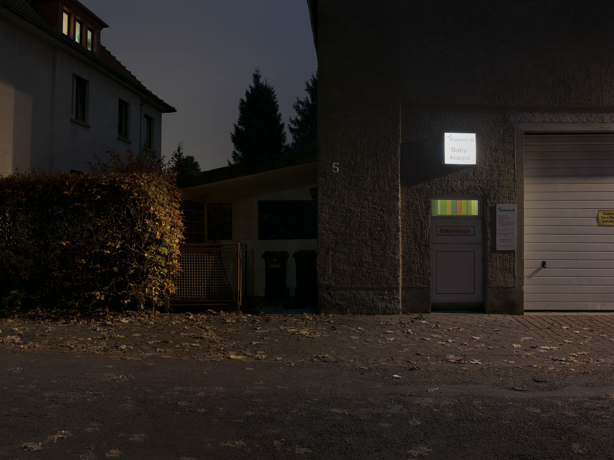 Babyklappen sind Orte, an denen Mütter ihre ungewünschten Babys anonym zur Adoption freigeben können. Meist werden diese Orte heimlich aufgesucht, oft in der Dunkelheit. „Die Orte erscheinen zunächst sachlich funktional, sind aber lebensrettend. Mich hat vor allem die Szenerie interessiert, in der man sich wiederfindet, wenn man sich dazu entschlossen hat, die letzten Schritte mit dem Kind auch räumlich zu gehen“, so der Student. Bewusst hat er seine Fotos mit Langzeitbelichtung vom Stativ aus nachts angefertigt und auf zusätzliche Beleuchtung verzichtet. „Jede weitere Lichtquelle hätte das Ergebnis verfälscht und emotional aufgeladen“, so Robert Krischan ter Horst. Auch hinter dem Titel „Schnittstelle Leben“ stehe eine Bedeutung: „Der Titel beschreibt nicht nur den Punkt der Trennung im Leben von Mutter und Kind und dass es für beide nun anders weitergehen muss. Er beschreibt das Fenster auch architektonisch als bauliches Element, durch das in diesem Fall Leben angereicht und aufgenommen wird, denn bei jedem Fenster kann man ebenfalls von einer Schnittstelle zwischen innen und außen sprechen.“