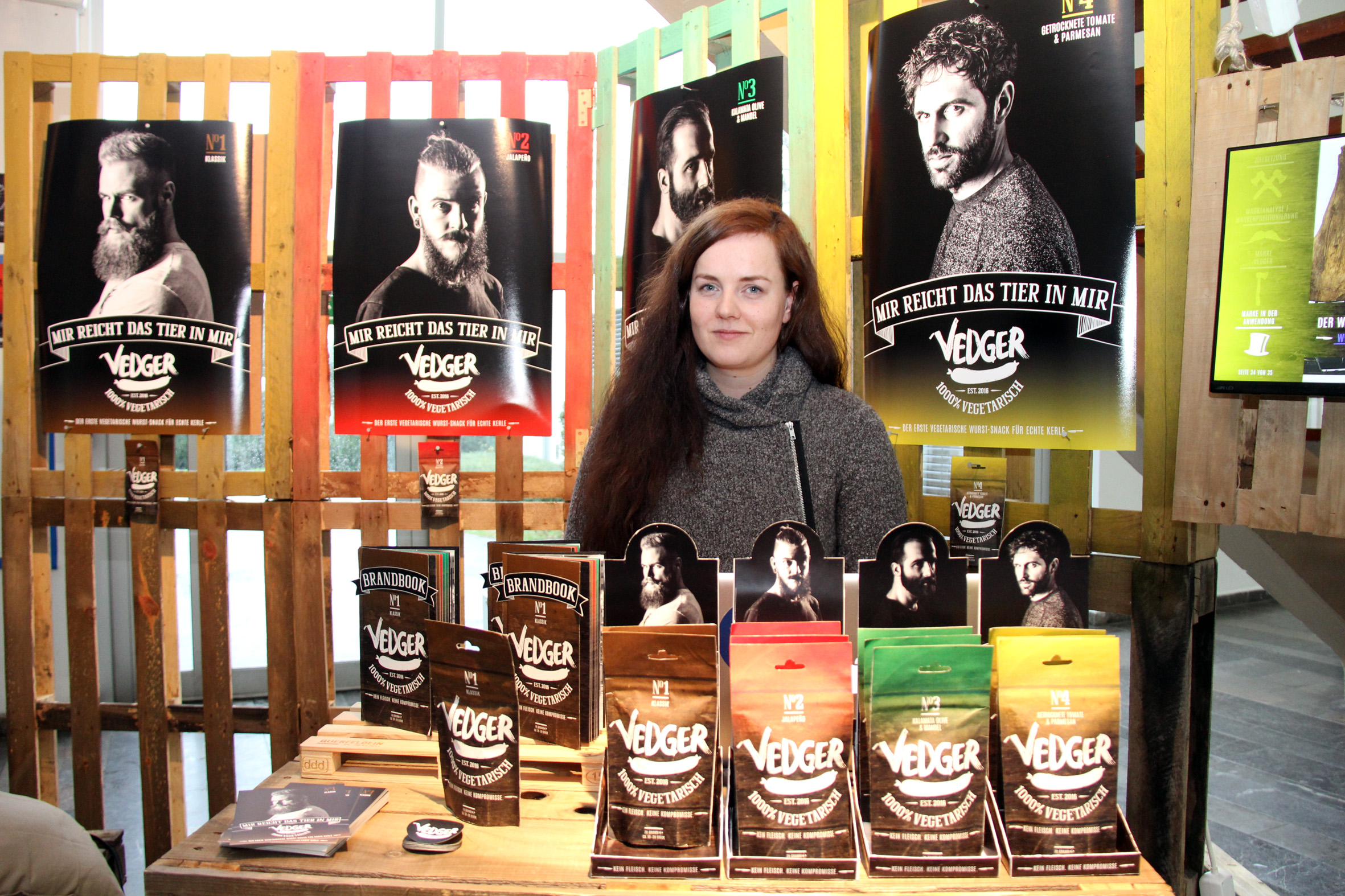 Anja Balsfulland hat sich mit ganz andrem befasst. "Vedger" heißt ihre "1000%vegetarische Wurst". Mit vier noch recht jungen, vollbärtigen Herren, die allesamt recht entschlossen dreinschauen, bewirbt sie ihr neues Produkt, das zu einer ganzen "Linie" gehören wird. "Echte Kerle essen Vedger, denn sie sagen: Mir reicht das Tier in mir." An diesem Ausstellungsstand kommt man nicht vorbei ohne hinzugucken, weil die vier so entschlossen scheinen. Übrigens hat sie die Models, erzählt Balsfulland, ganz schnell via Facebook-Aufruf gefunden "und die hatten richtig Spaß an der Sache."
