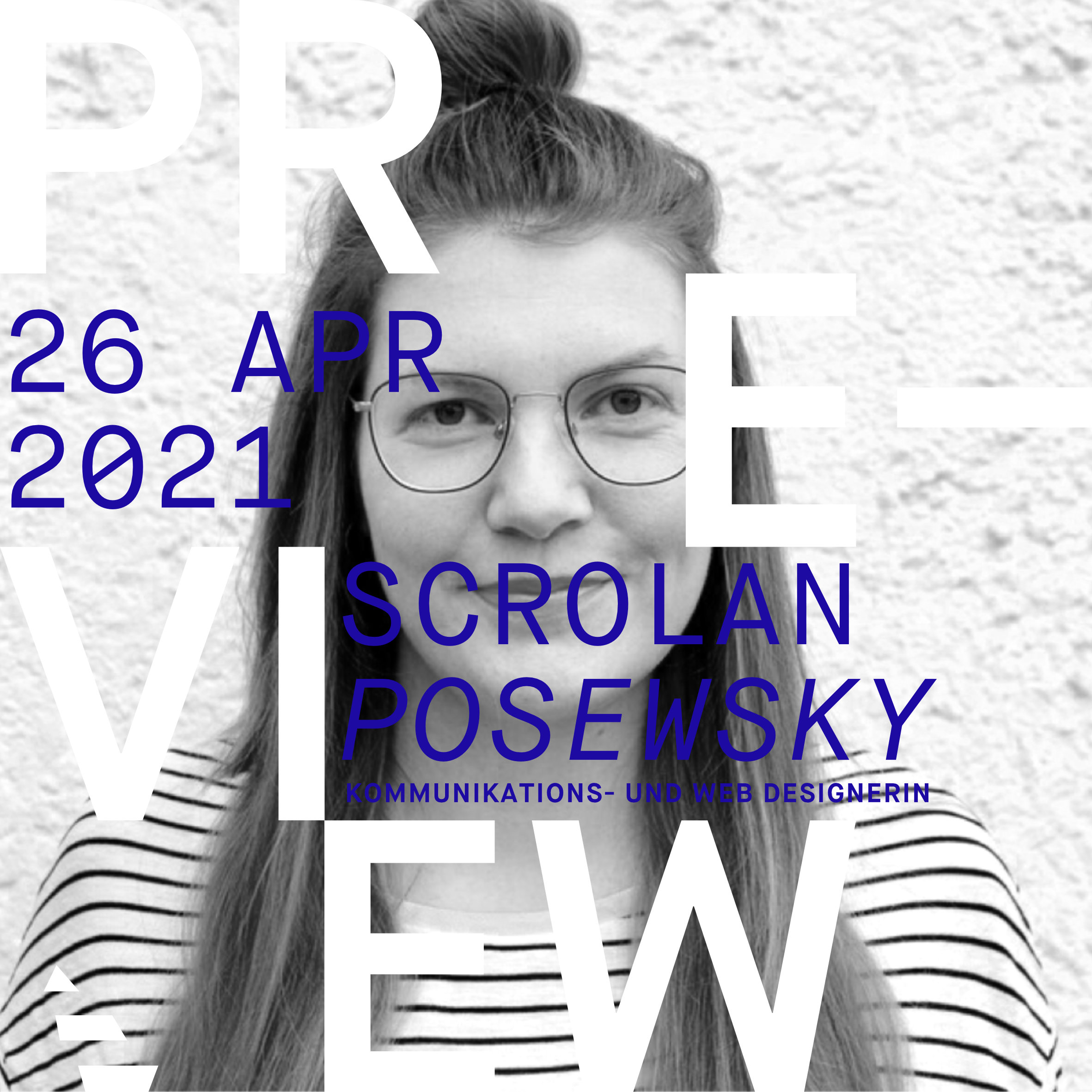 Am Dienstag, 04.05.2021, um 18.00 Uhr ist die Kommunikations- und Web Designerin Scrolan Posewsky zu Gast und wird über ihre Projekte und Arbeitsweise sprechen.