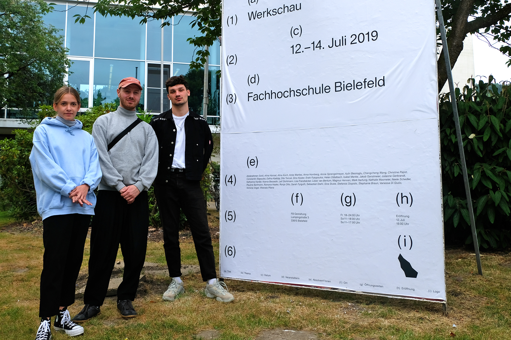 Das studentische Werkschau-Team bilden in diesem Jahr die drei Kommunikationsdesign-Studierenden Kaan Kanbur, Tilman Kunkel und Susann Iseringhausen. Sie haben unter der Letung von Prof. Dirk Fütterer den Werkschau-Katalog und die dazugehörigen Plakate gestaltet.
