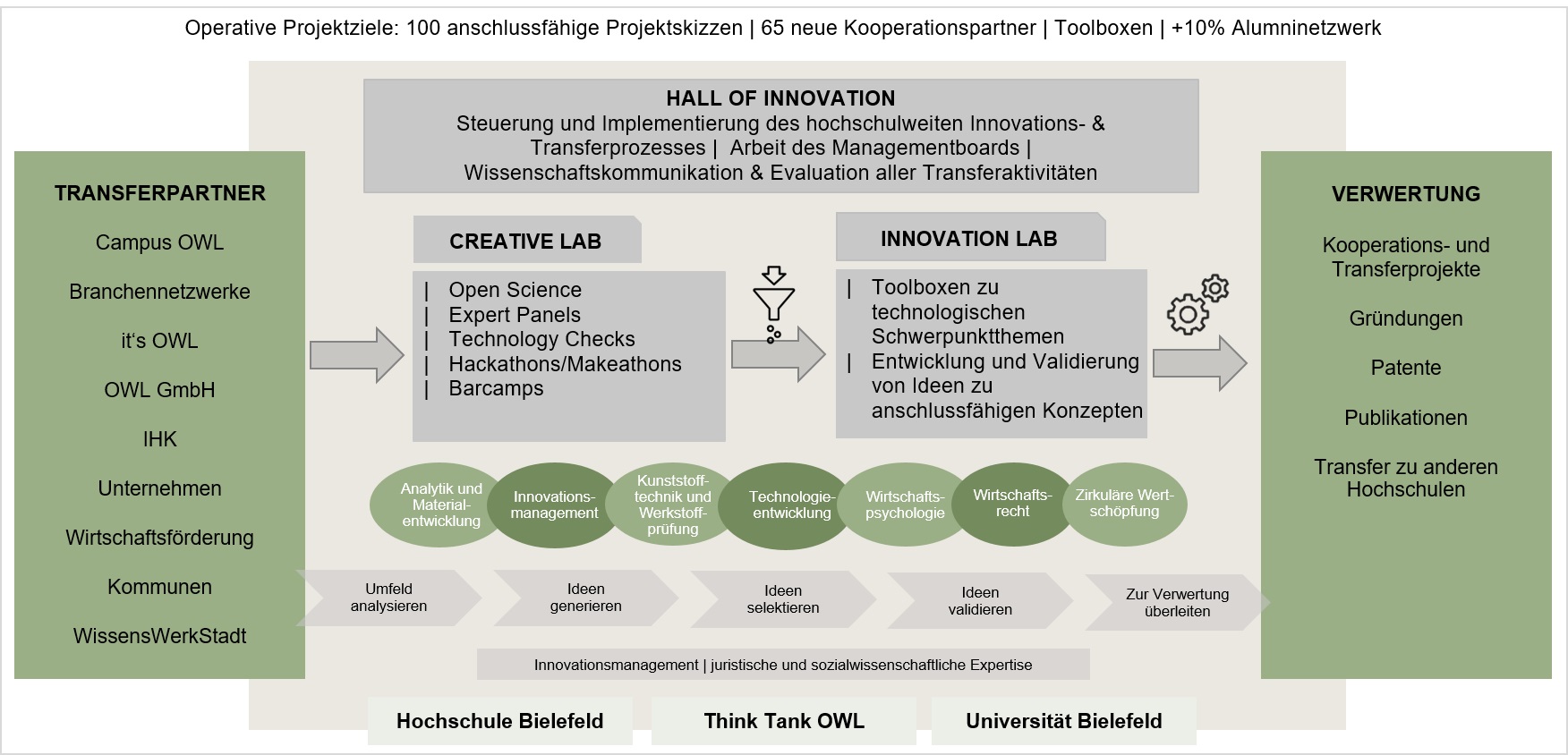 Die Hall of Innovation ist das Dach des Projekts. Hier sind zentrale administrative und unterstützende Aufgaben angesiedelt wie Projektleitung, Steuerung, Evaluation und Kommunikation. Aufgabe der Mitarbeitenden in der Hall of Innovation ist es, den Dialog von Wissenschaft, Wirtschaft und Gesellschaft zu fördern.