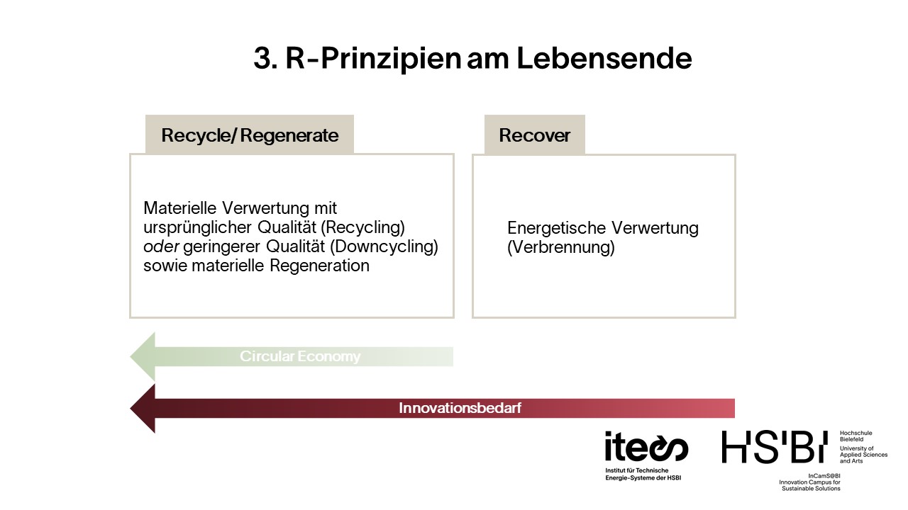 Am Produkt- bzw. Teil-Lebensende findet eine Verwertung statt. Das Lebensende bietet auch die Möglichkeit, kontinuierlich Recyclingmaterialien bereitzustellen und ebenso eine Möglichkeit, Biomasse für die Bioökonomie zu schaffen.