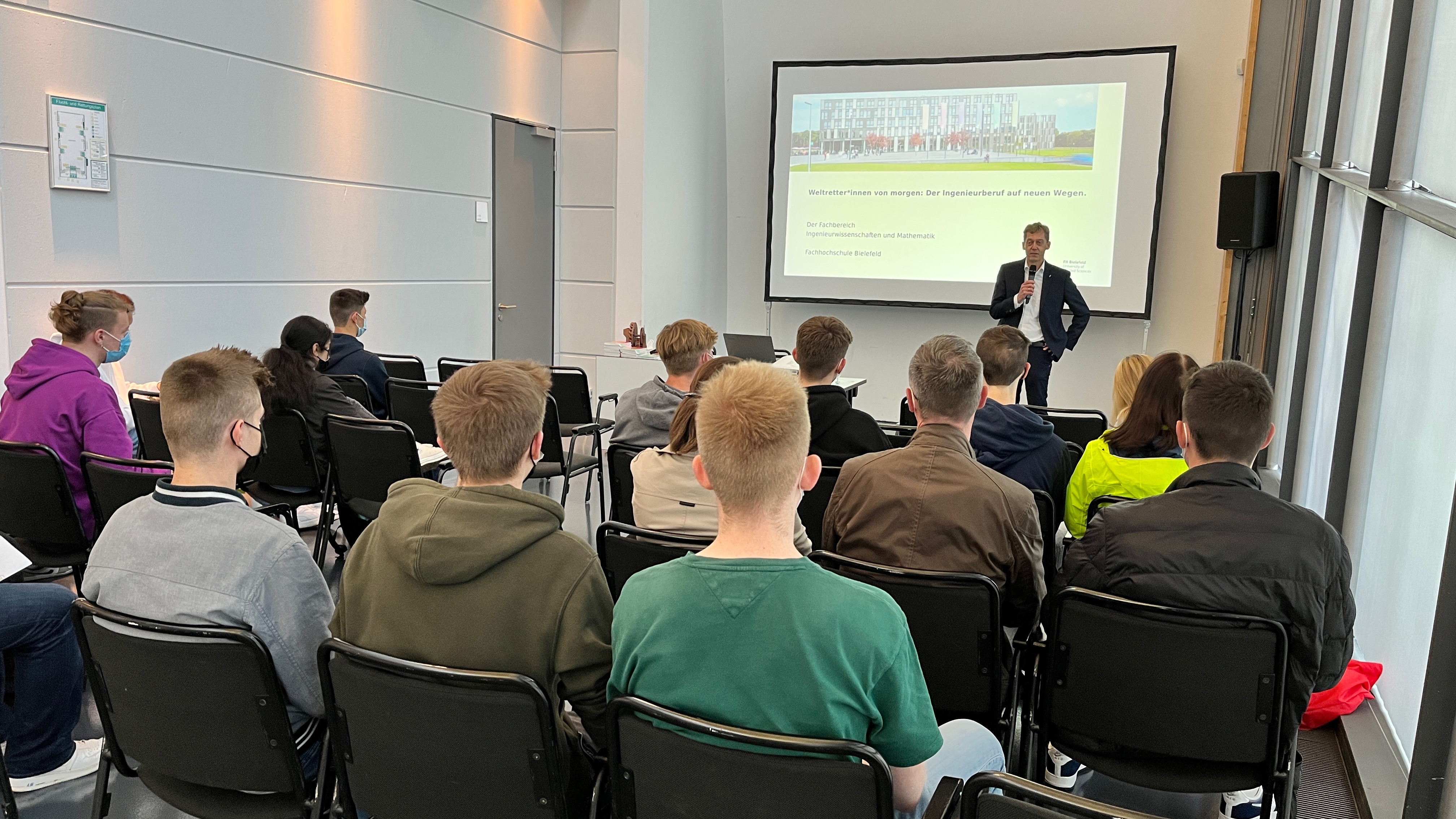 Über die Beratungsgespräche am Messestand hinaus gab es ein breites Vortragsprogramm. Prof. Dr.-Ing. Rolf Naumann, Dekan des Fachbereichs IuM, sprach am zweiten Messetag zum Thema: „Weltretter*innen von morgen: Der Ingenieurberuf auf neuen Wegen“. Mit einem lockeren Einstieg zu seinem persönlichen Werdegang „Ich wollte eigentlich Musik studieren ...“ und einem informativen Blick auf das Berufsbild gelang es Naumann, die volle Aufmerksamkeit der anwesenden Schülerinnen, Schüler, Lehrer und Eltern zu erhalten. Er machte deutlich, dass es die Fülle der zur Auswahl stehenden Studienmöglichkeiten den heutigen Generationen nicht leichter mache, den passenden Weg für sich herauszukristallisieren und erklärte daher kurzerhand die unterschiedlichen Schwerpunkte der mathematischen und ingenieurwissenschaftlichen Studiengänge. Zu Demonstrationszwecken stellte der Professor ein von Studierenden entworfenes 3D-gedrucktes Funktionsmodell – ein Wasserrad – zur Verfügung, welches auf Grundlage der Skizzen von Leonardo Da Vinci konzipiert wurde. Er beschrieb Ingenieurinnen und Ingenieure als Lösungsfinder für Industrie, Politik und Klima. „An der Fachhochschule Bielefeld dürfen sie angewandte, greifbare und praxisorientierte Lehre und Forschung erleben. Sprechen Sie uns jederzeit gerne an!“, so Naumanns abschließenden Worte.