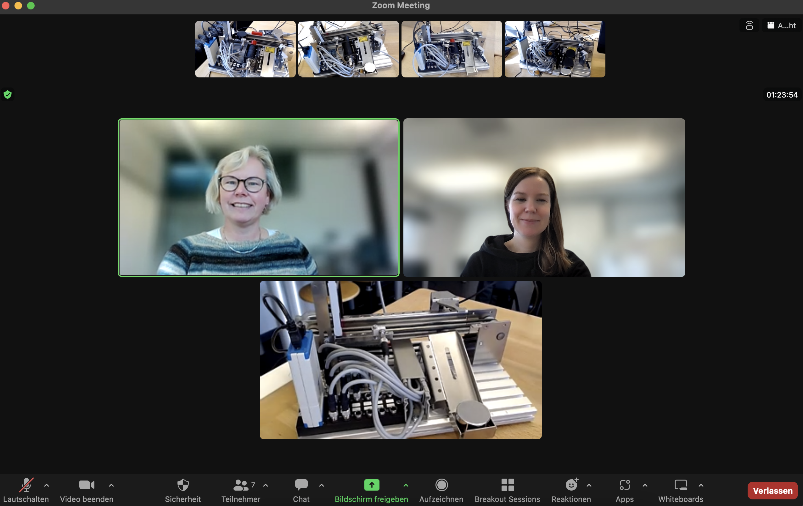Veranstaltungsorganisatorin Vanessa Prott-Warner und Dr. Rebecca Goebel, beide wissenschaftliche Mitarbeiterinnen des Fachbereichs Ingenieurwissenschaften und Mathematik (IuM), hatten sechs Arbeitsstationen auf dem Campus aufgebaut, um die geplante Fernwartung aus New York zu ermöglichen. Per Zoom schalteten sich die technikaffinen Studieninteressierten aus der elften Jahrgangsstufe gemeinsam mit ihrem stellvertretenden Schulleiter Oliver Frühwein sowie dem Mathe- und Informatiklehrer Holger Jessen-Thiesen ein.