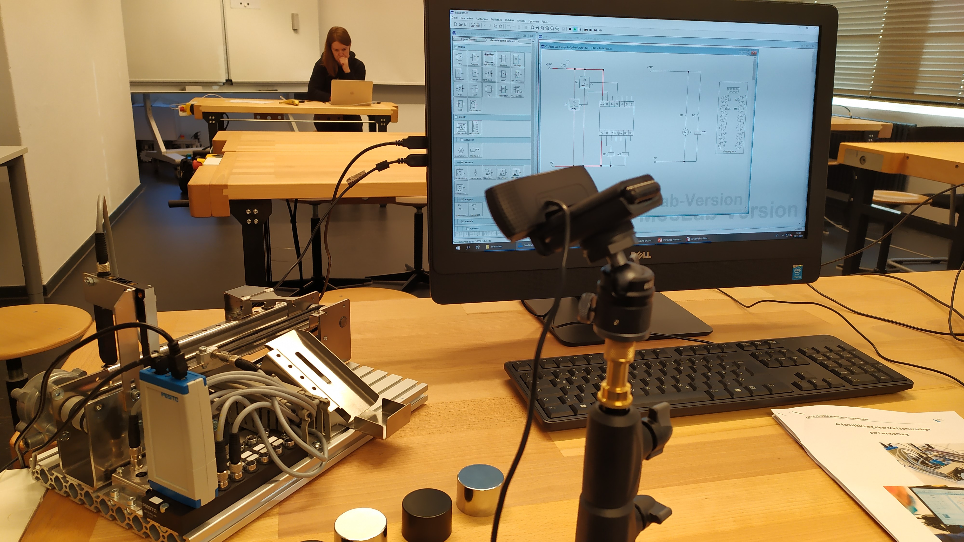 „Viele der Oberstufenschüler planen nach dem Abschluss ein Studium in Europa“, weiß Prott-Warner. Aus diesem Grund erfuhren die Studieninteressierten zunächst Einzelheiten über das Studienangebot der FH Bielefeld sowie dem praxisintegrierten Studienmodell des Campus Güterslohs, bevor der Praxisteil startete. „Wir haben uns für den Workshop 'Automatisierung einer Mini-Sortieranlage' entschieden, da dieser besonders geeignet ist, um einen Einblick in die modernen und industrienahen Studiengänge des Fachbereichs IuM gewinnen zu können“, erklärt Prott-Warner. „Die Teilnehmenden in den USA haben per Internet direkten Zugriff auf die Software-Oberfläche der Rechner in Gütersloh und können dank Kameratechnik das Live-Bild der aufgebauten Mini-Anlagen in Gütersloh beobachten und hoffentlich auch in Betrieb nehmen“, ergänzt Goebel mit einem Augenzwinkern.