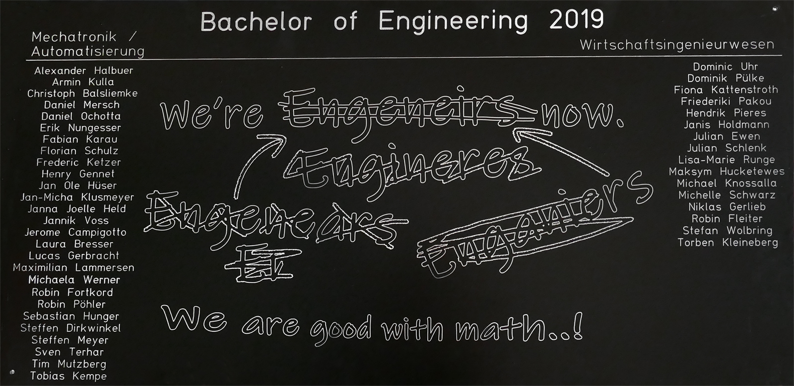 Diese ziert fortan den Eingangsbereich am Campus Gütersloh, Gleis 13. Absolvent Alexander Halbuer übergab die Tafel mit der grafisch spaßig aufgemachten Aufschrift: „We are Engineers now! We are good with math...! “ im Namen aller ehemaligen Studierenden an Prof. Dr. Andrea Kaimann, Studiengangsleiterin des praxisintegrierten Bachelorstudiengangs Wirtschaftsingenieurwesen, die sie stellvertretend für den Fachbereich Ingenieurwissenschaften und Mathematik (IuM) entgegennahm.
