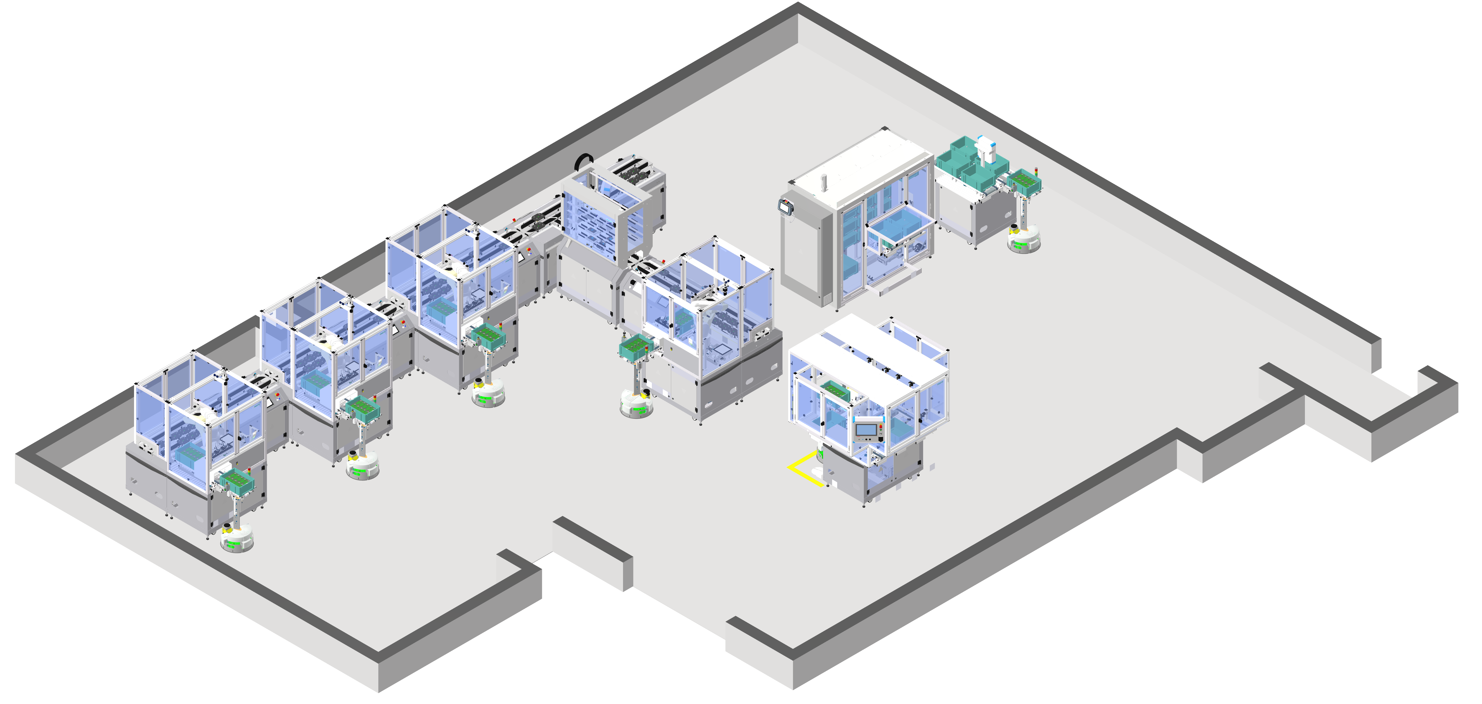 The modules of the production line, for example the robot cells, can be separated from the production line to operate in stand-alone mode. In this way parallel studies around different questions is granted.