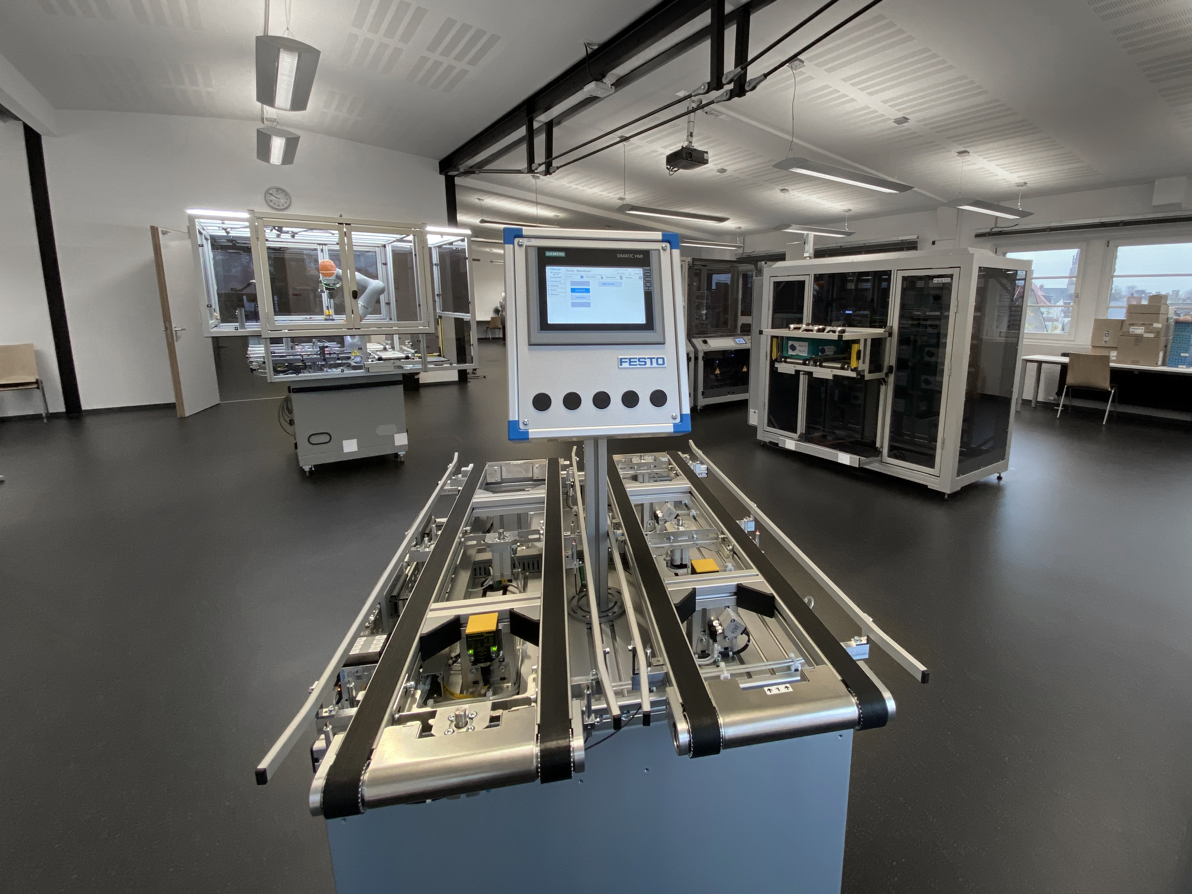 Nahaufnahme der Puffer-Station. Hier können Kisten aus dem System ausgeschleust oder in das System eingebracht werden. | Close up of the puffer station. New material can enter the production at this point and finished products can be outputted via this station.