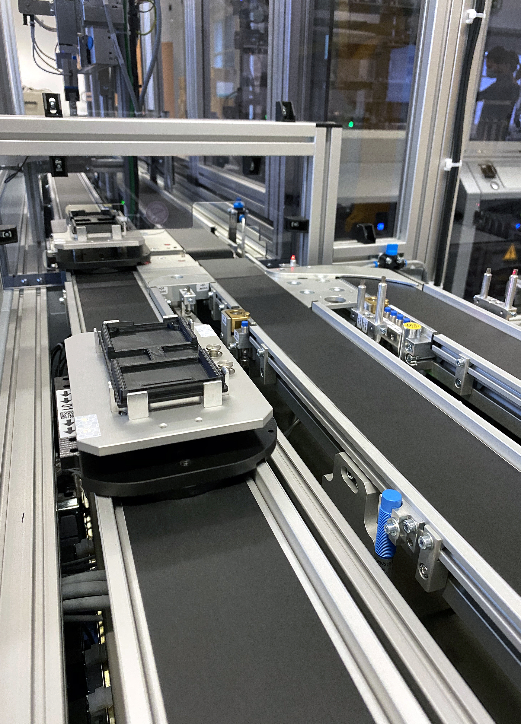 Nahaufnahme des Förderbandes mit einer Gehäuseunterschale auf dem Weg zur ersten Robotermontagezelle. | Close up of the conveyer belt with moving back covers of the product case.