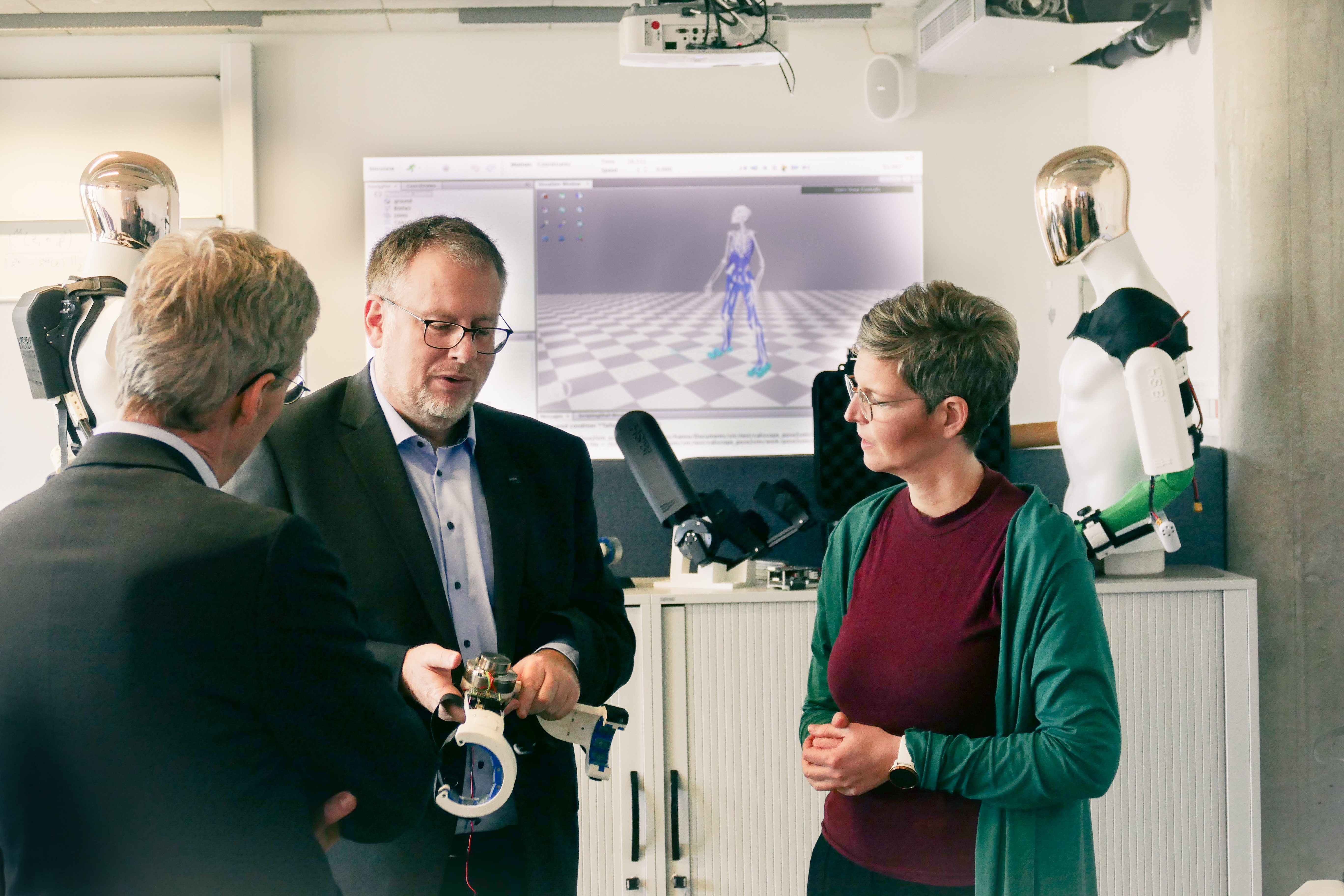 Wie nah Forschung am Puls der Zeit ist, wurde beim Besuch von Brems im Labor für Biomechatronik und Eingebettete Systeme eindrucksvoll sichtbar. Dort entwickeln Forschende und Studierende kooperative Roboter, Wearables sowie Assistenz- und Mobilitätssysteme – Technologien, die Menschen im Alltag und Beruf direkt unterstützen. Ein Forschungsschwerpunkt des Fachbereichs liegt im Bereich Human-Centred Mechatronics & Medical Technology am Institut für Systemdynamik und Mechatronik (ISyM), wo technische Systeme im engen Zusammenspiel mit menschlich-physiologischen, anatomischen und kognitiven Prozessen entwickelt werden. Ziel ist es, Mensch und Technik als kooperatives Gesamtsystem zu denken und entsprechende Eigenschaften in mathematisch-technische Modelle zu übertragen. Das Spektrum reicht von kooperativen Robotern in der Fertigung über akustische Assistenzsysteme bis hin zu teilautonomen Mobilitäts- und Körperassistenzsystemen, adaptiven Wearables oder Laufrobotern. Im Mittelpunkt steht dabei stets die Frage, wie Technologie den Menschen sinnvoll ergänzt – sicher, adaptiv und anwenderorientiert. Das Labor ist zudem in die Lehre integriert und ermöglicht den Studierenden, theoretisches Wissen in praktische Fähigkeiten zu verwandeln. Besonders diese Integration von Forschung und Lehre ist prägend für den Fachbereich