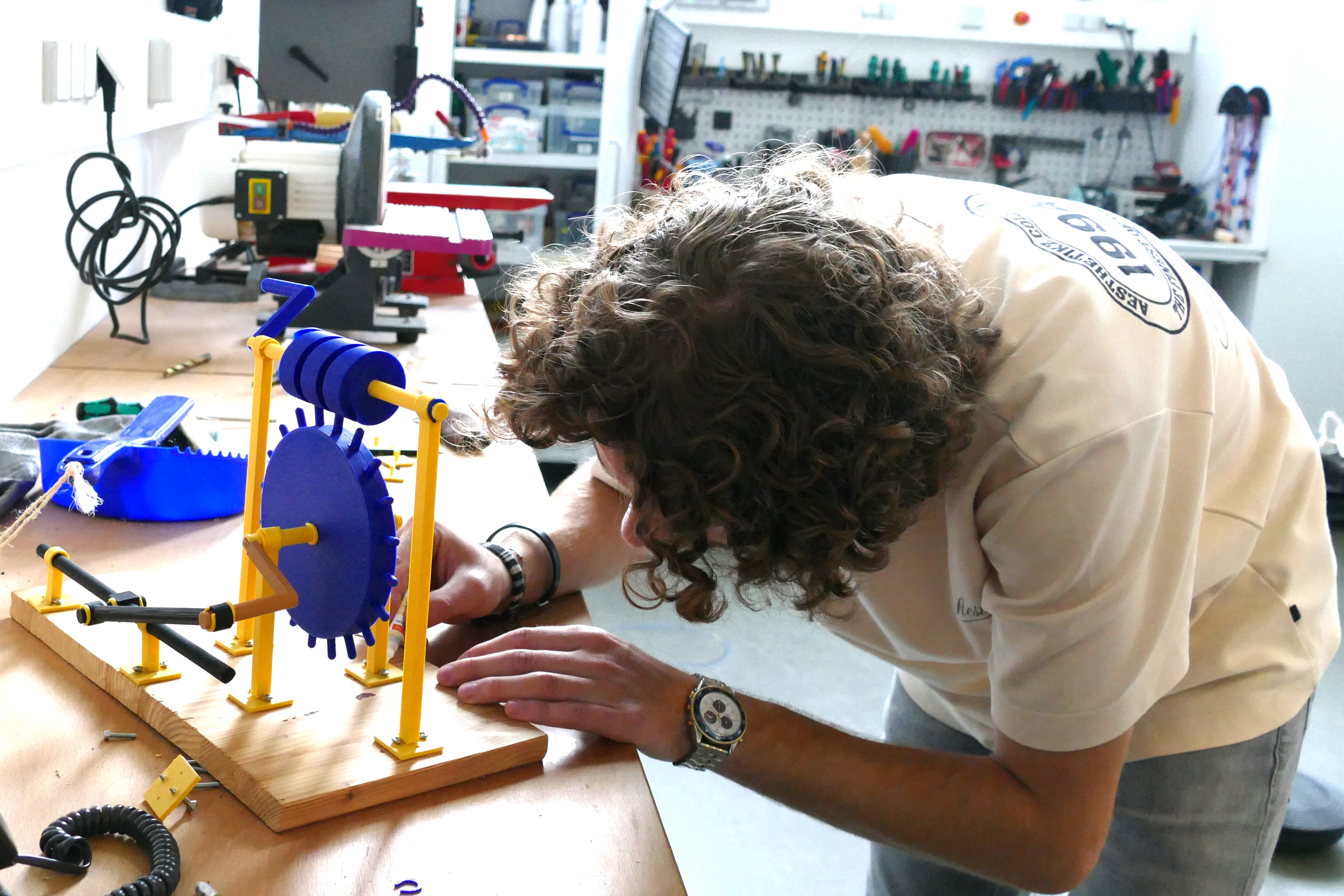 Arthur von der PXL (Belgien) baut die finalen Teile des Da Vinci-Mechanismus zusammen. Dieser wandelt eine Drehbewegung in eine lineare Hin- und Herbewegung.