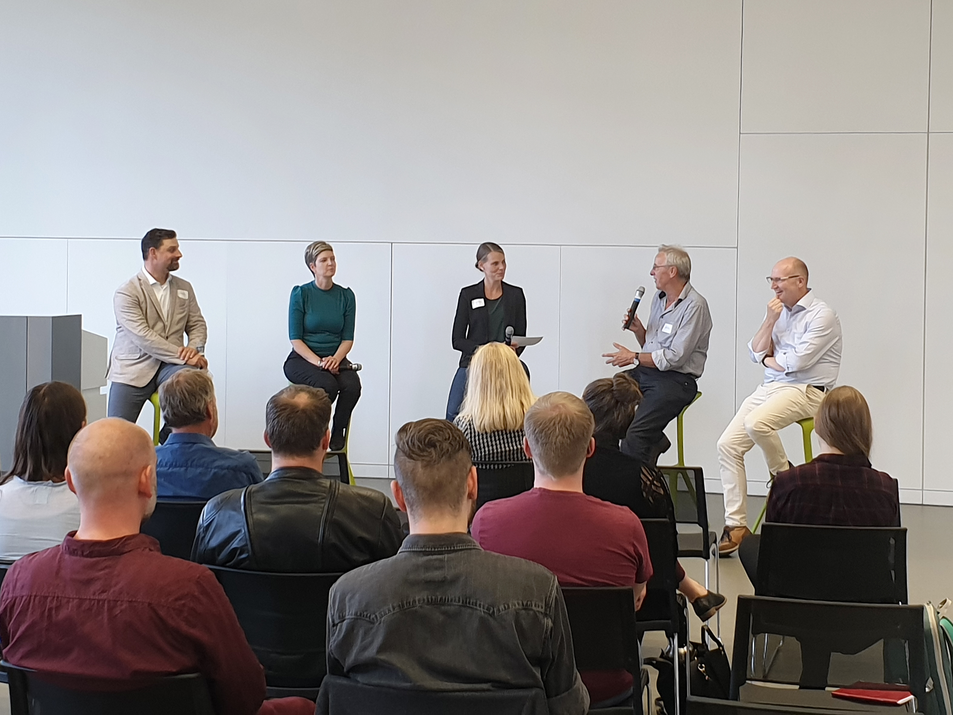 Podiumsdiskussion zum Thema sichere Energieversorgung und Energiewende: Sascha Gödecke (Leiter des Kommunalmanagements, Westfalen Weser Netz GmbH), Wibke Brems (Fraktionsvorsitzende der Grünen im Landtag NRW), Sissy-Christin Lorenz (Moderatorin), Johannes Lackmann (Geschäftsführer, WestfalenWIND GmbH) und Michael Esken (Bürgermeister der Stadt Verl) (von links nach rechts).