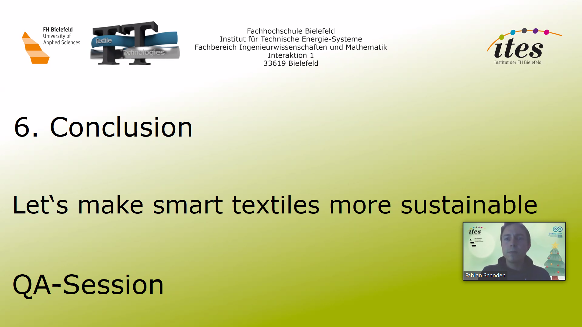 Über das Thema Nachhaltige Textilien und das neue EU-Abfallgesetz referierte Fabian Schoden, Doktorand am Institut für Technische Energie-Systeme der FH Bielefeld. In seinem Vortrag machte er auf Probleme bei der Produktion von Textilien aufmerksam, unter anderem auf die Fast-Fashion-Industrie und die bei der Produktion anfallenden Chemikalien und Umweltauswirkungen. Intelligente Textilien stellen bei der Frage der Nachhaltigkeit eine besonders große Herausforderung dar, bieten aber auch Chancen um Kreisläufe zu schließen. Schoden stellte einen nachhaltigen Design-Prozess für Kleidung vor, bei dem vor allem das Umdenken der Konsument*innen weg vom übermäßigen Konsum eine entscheidende Rolle spiele. Er schloss seine Präsentation mit dem Appel: „Lasst uns gemeinsam die intelligenten Textilien nachhaltiger gestalten.“