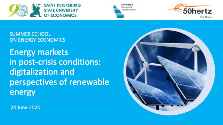 Auswirkungen der Corona Pandemie auf die Energiemärkte war das Thema einer internationalen Summer School am Institut für technische Energiesysteme. Der exakte Titel lautete „Energy markets in post-crisis conditions: digitalization and perspectives of renewable energy”. Die Organisatoren kamen von der Universität St. Petersburg (UNECON), vom Institut für technische Energiesystem (ites) der FH Bielefeld und vom deutschen Energietransportnetzbetreiber 50Hertz aus Berlin. Mehr als 44 Teilnehmerinnen und Teilnehmer, darunter zahlreiche Studierende, nahmen an der Veranstaltung am 24. Juni online teil.