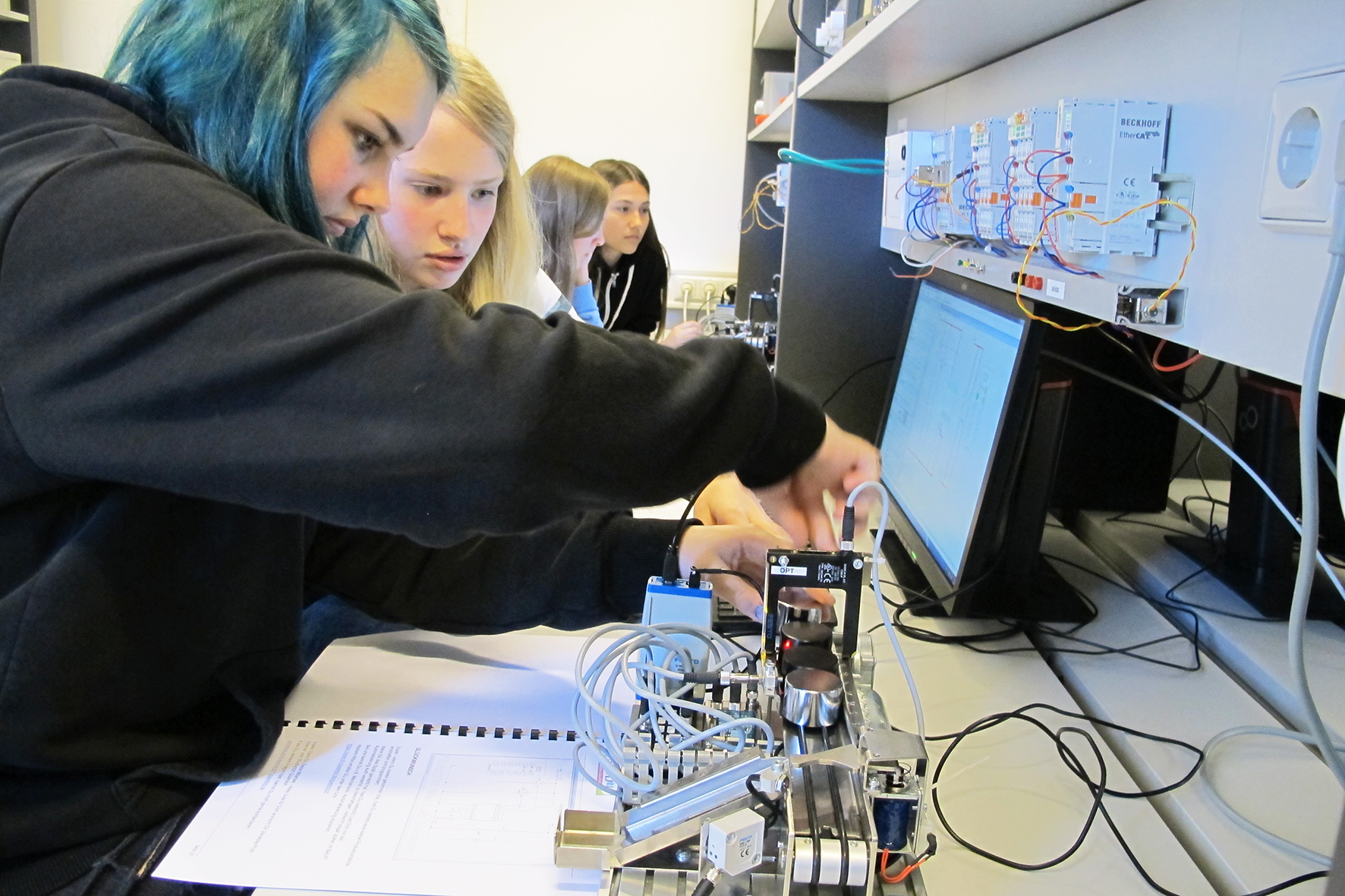 Acht Schülerinnen befassen sich am Studienort Gütersloh mit Automatisierungstechnik.