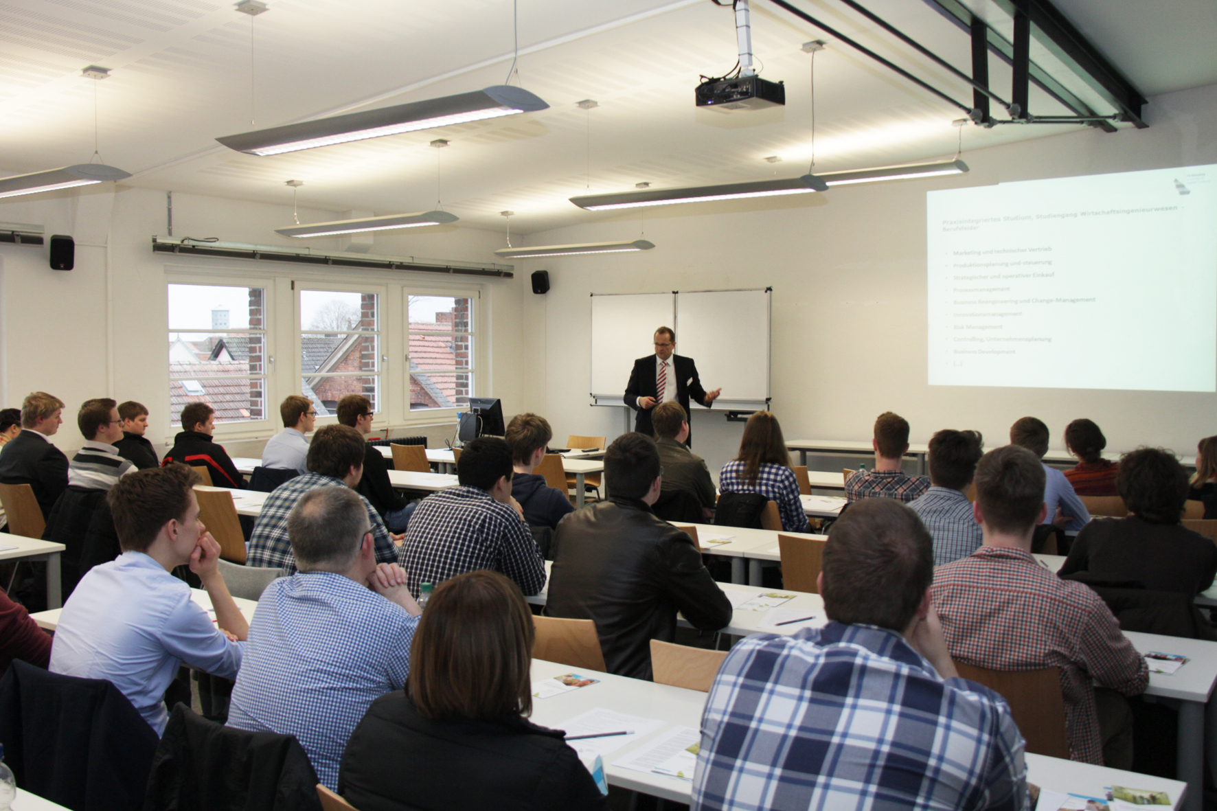 Vanessa Prott-Warner, die die Informationsveranstaltung organisiert hat und auch am Studienort lehrt, berichtet über das charakteristische Umfeld, welches ein Studium in Gütersloh auszeichnet: „Hier wird anwendungsorientiert gelehrt. Studierende sind in den Unternehmen von Anfang an mit ingenieursmäßigen Fragestellungen konfrontiert und sind so von Beginn an in ihre spätere Berufswelt integriert.“ Dies kann auch Catharina Borgart bestätigen, die über die kooperierenden Unternehmen informierte. „Mit über 100 beteiligten Firmen aus der Region, aber auch außerhalb sind wir gut aufgestellt und bieten eine große Auswahl an unterschiedlichen Unternehmen an. Im Unternehmensportal auf unserer Website sind aktuelle Stellenausschreibungen direkt zu sehen.“
