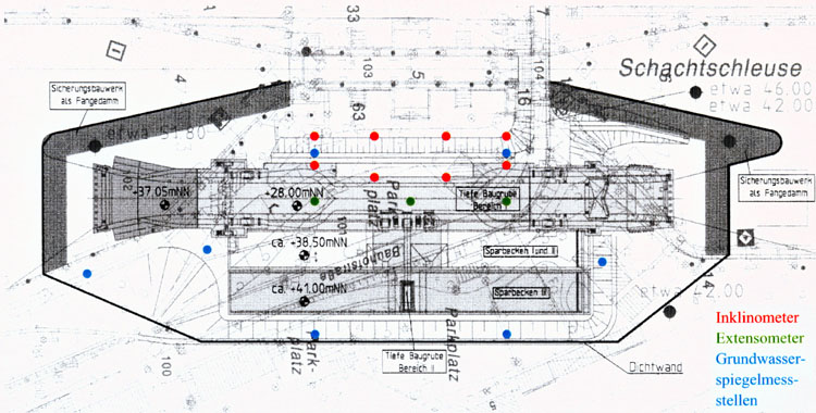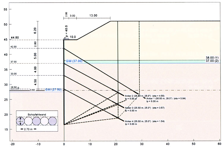Die Standsicherheitsnachweise wurden mit Hilfe der Programme STABILITY und RETAIN der GGU-GMBH geführt. Für die weiteren Berechnungen wurde eine Kombination aus einer 4-fach rückverankerten, überschnittenen Bohrpfahlwand zur bestehenden Schachtschleuse und einer Böschung auf der gegenüberliegenden Seite gewählt.