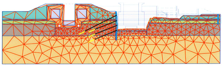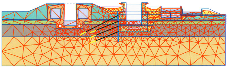 In einer numerischen Simulation wurde die gewählte Konstruktion hinsichtlich der Entwicklung der Verformungen und einer eventuellen Beeinträchtigung der alten Schleuse untersucht. Das nach der Finite-Elemente-Methode (FEM) entwickelte Modell ist in Bild 3 bzw. Bild 4 dargestellt. Die Berechnungen erfolgten mit dem FEM-Programm PLAXIS (Version 7.2). Die Ergebnisse zeigen, dass durch die gewählte Verbauart keine Schäden an der denkmalgeschützten Schachtschleuse zu erwarten sind.