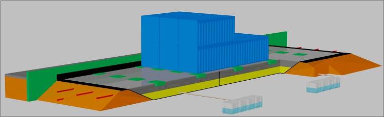 Die Mindener Hafen GmbH plant den Neubau eines Containerhafens östlich von Minden. Beim Neubau des Hafens soll die Flächenversiegelung weitgehend eingeschränkt werden. Es wurde ein Versuchsfeld mit einer Grundfläche von ca. 500 m² angelegt. Die Stellfläche bietet Platz für 12 Container und besteht aus einer Schottertragschicht, die auf den anstehenden Kiessanden aufgeschüttet wurde. Die Container stehen auf 1,60 x 1,60 m großen Betonfundamenten. Das Versuchsfeld dient zur Dokumentation der Versickerung bzw. der Wasserbilanz und zur Erprobung verschiedener Ausführungen der Tragschicht und der Abstellpunkte für die Container.