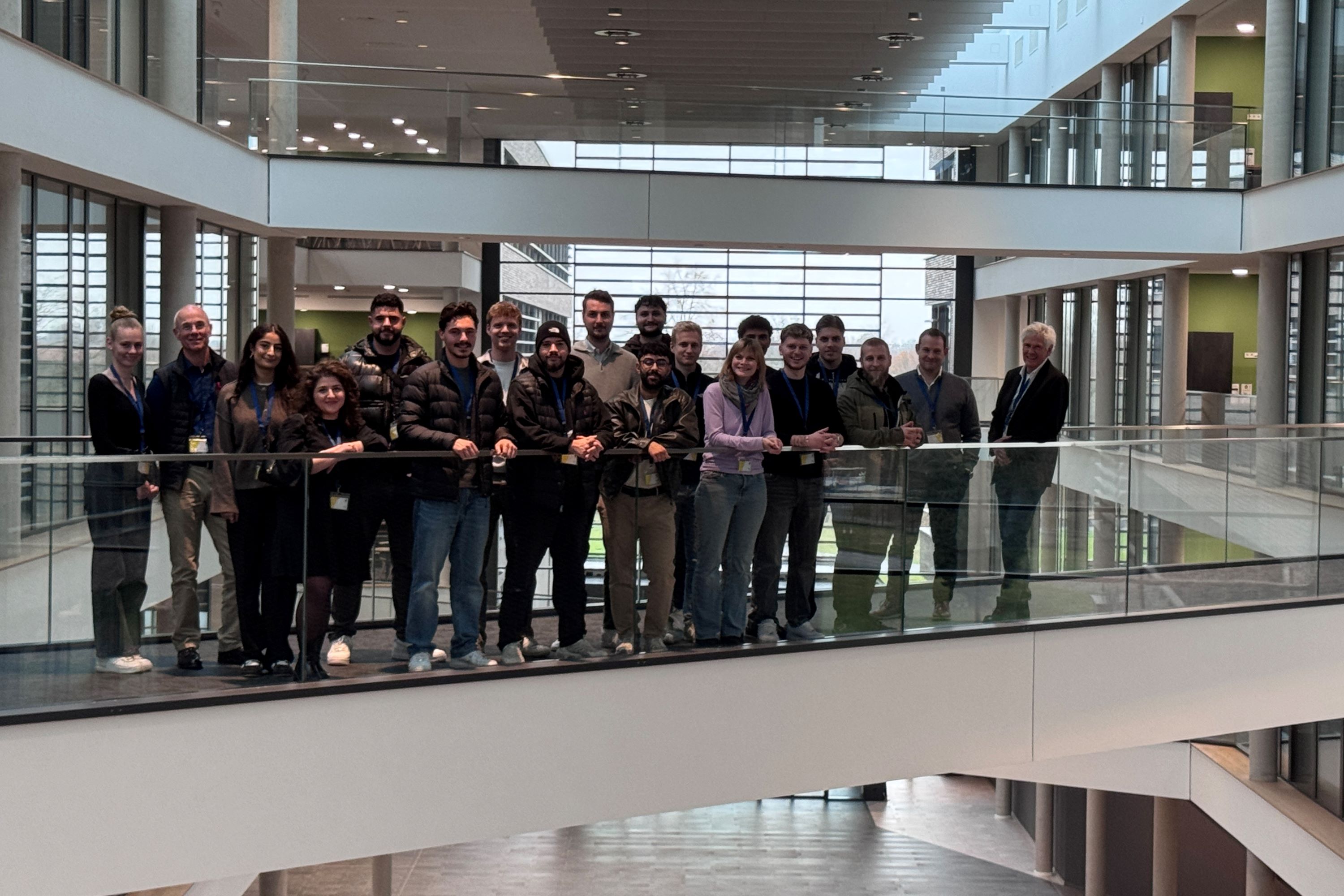 Die neue Zentrale der EDEKA Minden-Hannover bietet Platz für rund 2.000 Mitarbeitende, die die Jahre zuvor auf 19 Standorte im Stadtgebiet verteilt waren. Der Neubau besteht aus fünf 4-geschossigen Gebäudewürfeln, die entlang einer überdachten Magistrale angeordnet sind, verbunden über mehrere Brücken. Organisiert wurde die Exkursion von Prof. Dr. Ulrich Schramm, der am Campus Minden für das Lehrgebiet Technischer Ausbau/Facility Management zuständig ist, und dem Lehrbeauftragten Sven Mylius vom Beratungsunternehmen Drees & Sommer SE.