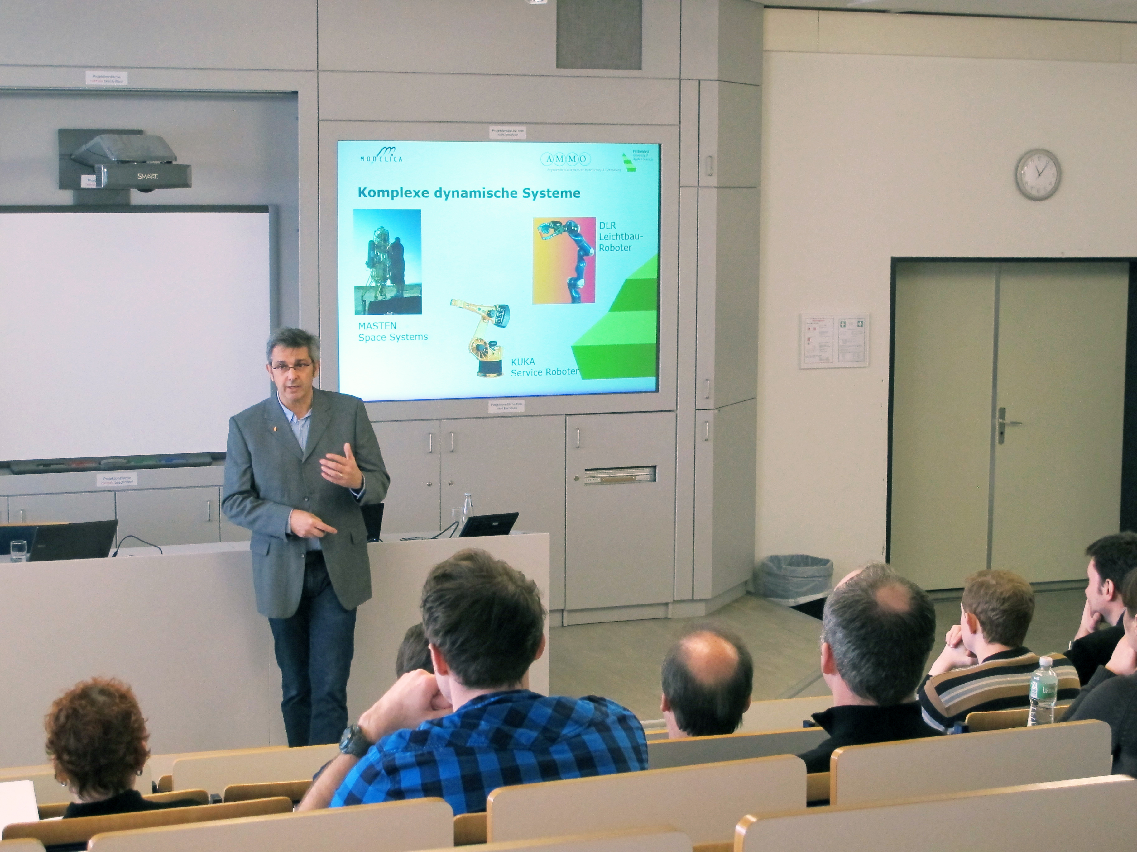 So berichtete Professor Bernhard Bachmann unter dem Titel "Vom Modell zur Simulation - Effiziente computergestützte Mathematik" über die Aktivitäten seines Teams, welches sich mit der Simulation komplexer dynamischer Systeme mit Hilfe der Programmiersprache Modelica beschäftigt. Bachmann und seine Mitarbeiterinnen und Mitarbeiter haben wesentlich zur Weiterentwicklung dieser Programmiersprache beigetragen, mit der sie anspruchsvolle mathematische Probleme lösen. Ergebnis sind unter anderem die erfolgreiche Promotion seiner Mitarbeiterin Sabrina Proß sowie zahlreiche Veröffentlichungen und Vorträge auf internationalen Tagungen. Drei weitere Promotionsverfahren laufen.