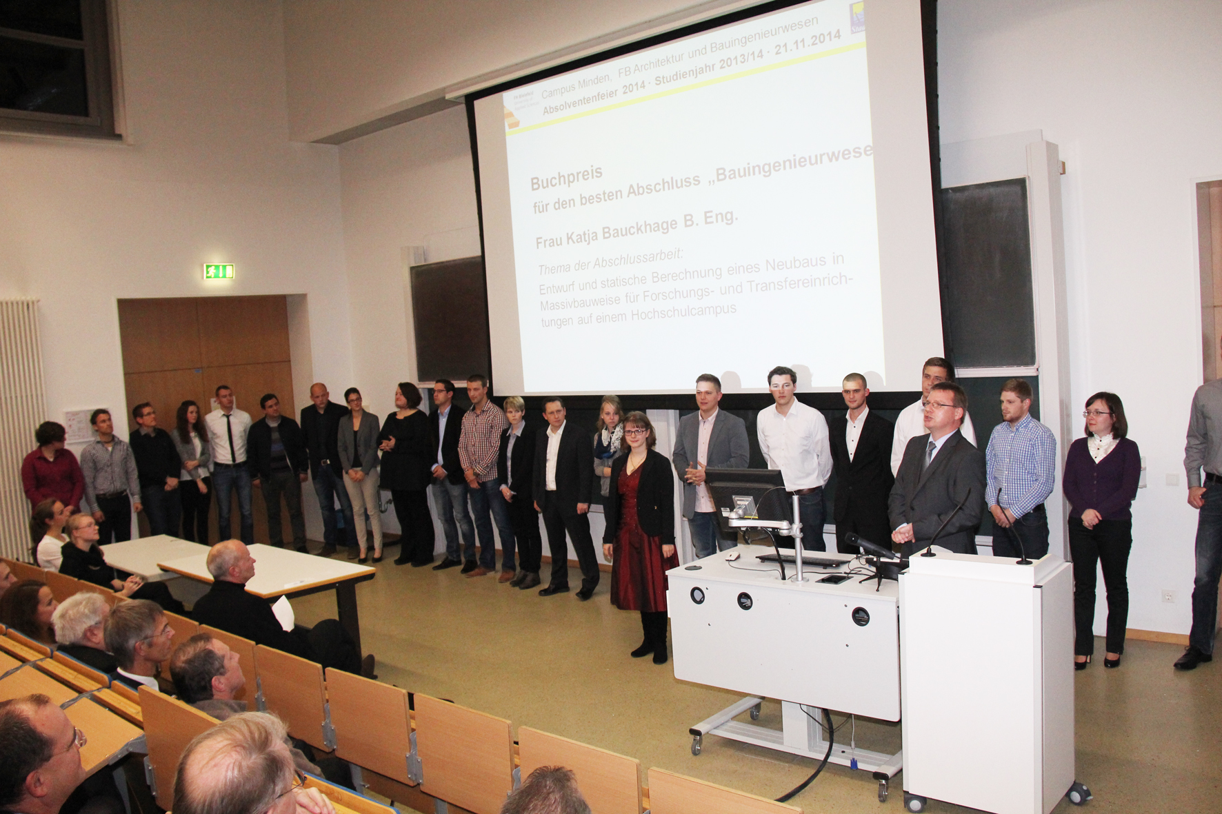 Minden (fhb). Obwohl nur gut die Hälfte der 104 Absolventinnen und Absolventen aus den fünf Studiengängen Architektur, Bauingenieurwesen, Projektmanagement Bau, Projektmanagement Infrastruktur/Logistik und Integrales Bauen an der Feier teilnehmen konnte, blieben im Audimax am vergangenen Freitag lediglich eine Handvoll Plätze frei. Rund 190 Personen hatten sich angemeldet, darunter knapp 60 Ehemalige mit Eltern, Geschwistern und Freunden.