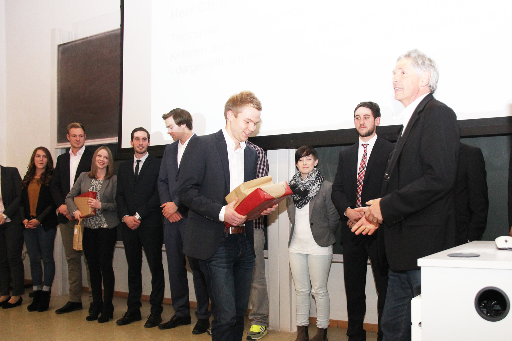 Der Ausbau des Campus machte sich auch an diesem Abend bemerkbar, denn im 2011 neu eingeführten Bachelorstudiengang "Projektmanagement Infrastruktur / Logistik" gab es zum ersten Mal Absolventen: Drei Studentinnen und drei Studenten haben das neue Programm erfolgreich abgeschlossen. Die beste Note erzielte Hermann Schulz, der seine Abschlussarbeit zum Thema "Exemplarische Überprüfung der präventiven Instandhaltung von Entwässerungsanlagen mit Hilfe einer mobilen Spüleinrichtung auf Hauptbahnen der DB AG schrieb. Dazu sagte Studiengangsleiter Professor Dr. Matthias Namuth: "Viele Arbeiten in diesem Studiengang befassen sich mit der Bahn, da scheint sich ein Trend abzuzeichnen."