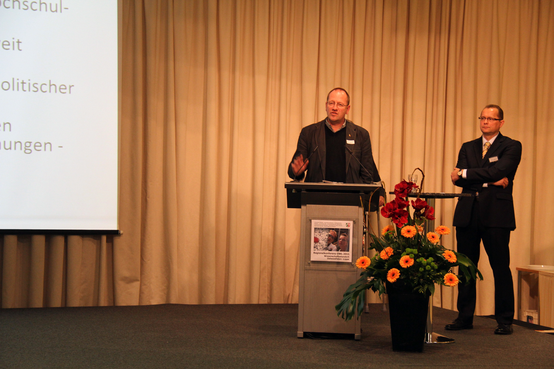 Aktiv teilgenommen an der OWL-Regionalkonferenz hat die FH Bielefeld mit zahlreichen Vertretern. So leitete Präsidentin Prof. Dr. Rennen-Allhoff das Forum „Beiträge aus Hochschulen für eine innovative Versorgung in Pflege und Gesundheit“, in dem unter anderen Prof. Dr. Matthias Mertin von der Lehreinheit ‚Pflege und Gesundheit‘ mitdiskutierte. Im Forum „Beiträge aus Studium und Lehre für den regionalen Arbeitsmarkt und die Talententwicklung“ gaben Prof. Dr. Andreas Beaugrand, Vizepräsident für Lehre und Studium, und Marcus Miksch, der Koordinator für die praxisintegrierten Studiengänge an der FH Bielefeld, Einblicke in gelungene Ausbildungs-Partnerschaften. Miksch: „Wir haben in kurzer Zeit die mittelständischen Unternehmen von unserem Konzept überzeugen können. Das gilt sowohl für den Studienort Gütersloh als auch für den Standort Minden.“ Prof. Beaugrand: „Was wir jetzt brauchen ist eine verlässliche finanzielle Unterstützung vom Land.“ Und bestenfalls auch von Unternehmen, die bereit sind, zum Beispiel Stiftungsprofessuren einzurichten. Damit die Talente in OWL bleiben.