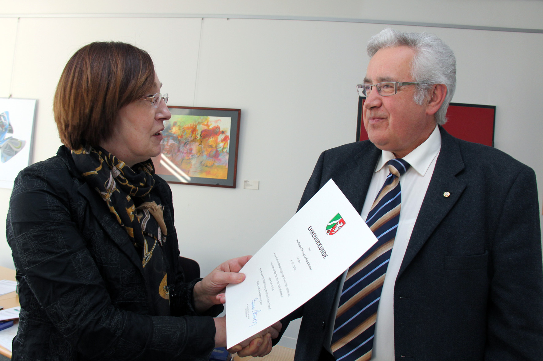 Bielefeld (fhb). Auf 25 Jahre Arbeit im öffentlichen Dienst konnte jetzt Prof. Dr.-Ing. Gerhard Weber zurückblicken. FH-Präsidentin Prof. Dr. Beate Rennen-Allhoff überreichte ihm die Jubiläumsurkunde und bedankte sich für seine Arbeit in Lehre, angewandter Forschung und in der akademischen Selbstverwaltung. Professor Weber vertritt am Fachbereich Ingenieurwissenschaften und Mathematik (IuM) das Lehrgebiet 'Strömungs- und Wärmelehre'. Er hatte zum Wintersemester 1992 seine Arbeit am Fachbereich Maschinenbau der FH Bielefeld aufgenommen.