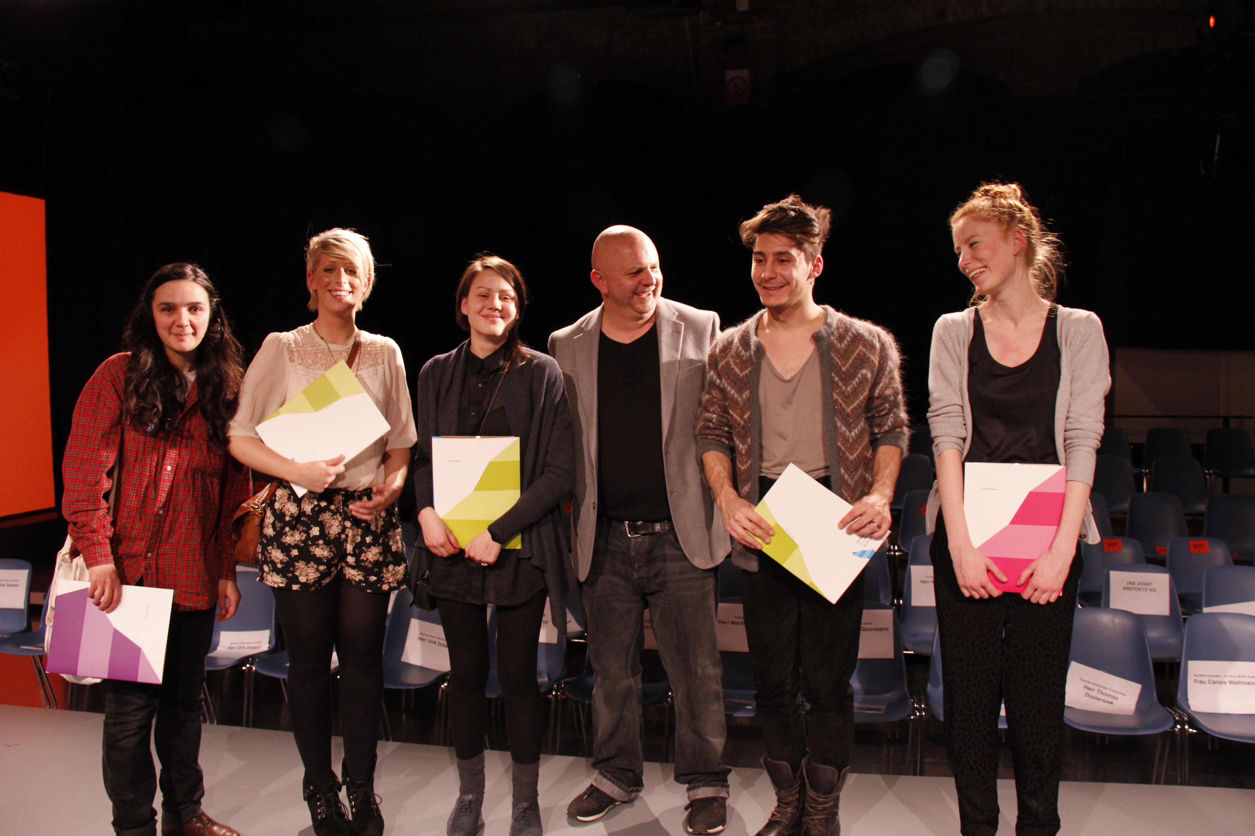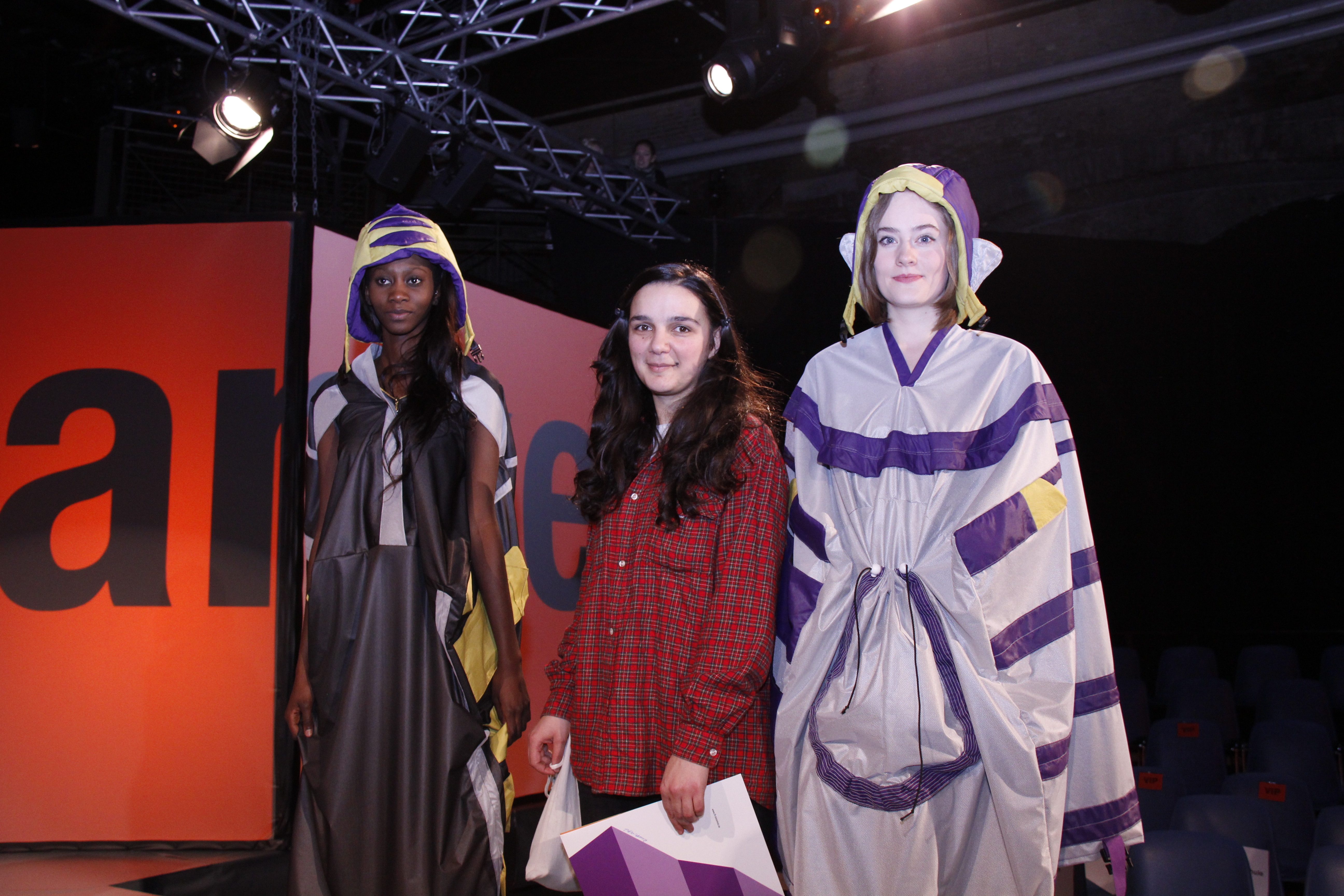 Einen mit je 500 Euro dotierten Preis für die beste Semesterarbeit erhielten Leonie Barth und Serhat Isik vom Projekt "Stilmode" sowie Lili Gabinashvili, die dem Projekt "Kleid/Architektur/Kleid" ihre Kreationen beisteuerte. Betreut wurden die Studierenden von Professorin Willemina Hoenderken und Professor Kai Dünhölter. Die Inspirationsquelle für Leonie Barths Kollektion "Einschnitt" war das Bauhaus in Weimar. Falten und Schlitze verleihen ihren Outfits in der Bewegung Dreidimensionalität. Völlig unabhängig vom menschlichen Körper gestaltete Serhat Isik zunächst die Entwürfe für seine Kollektion "Der Existentialismus und die Existentialisten". Er entwarf Prismen und nähte sie zu Hemden und Tuniken zusammen. Doch erst der menschliche Körper gibt den Kreationen ihre Form. Eine ungewöhnliche Kollektion stellte auch Lili Gabinashvili mit "Frei Otto" vor. Sie schickte zwei Models mit einem Zelt auf die Bühne, die dieses dann vor dem Publikum zerlegten. Die variable Einsatzfähigkeit der Zeltplane erstaunte das Publikum, denn am Ende der Präsentation waren die Models in schicke Regenponchos gekleidet und trugen dazu Kapuzen im Helm-Look.