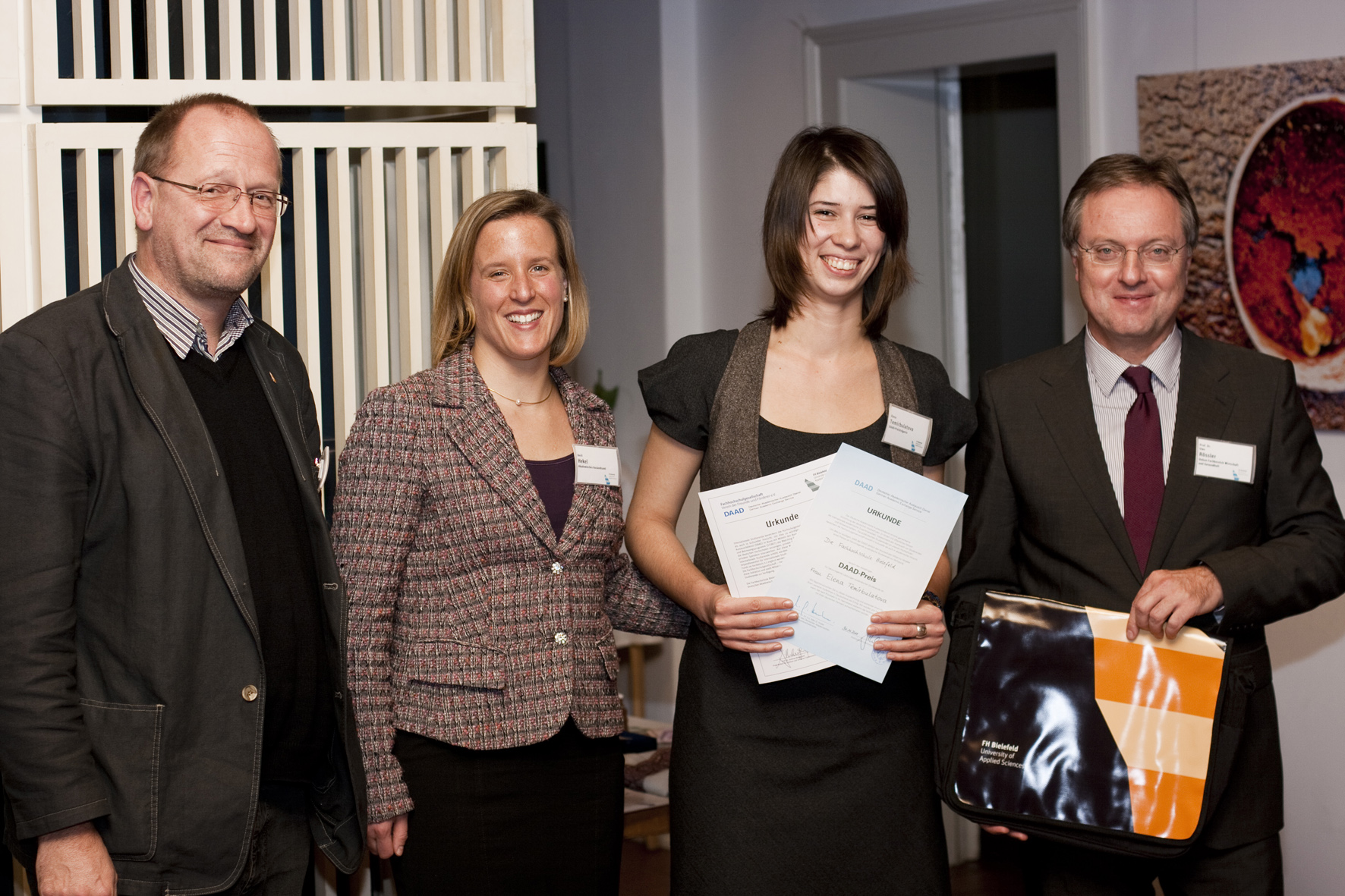 Bielefeld (fhb). Acht ausländische Studierende der Fachhochschule (FH) Bielefeld wurden am Mittwoch, 30. November, im Internationalen Begegnungszentrum (IBZ) mit Preisen und Stipendien ausgezeichnet. Elena Temirbulatova aus Russland erhielt den renommierten DAAD-Preis für hervorragende Leistungen ausländischer Studierender. Der Preis ist mit 1.000 Euro dotiert und wird jährlich vom Deutschen Akademischen Austauschdienst (DAAD) zur Verfügung gestellt, um gute akademische Leistungen und gesellschaftliches Engagement ausländischer Studierender zu würdigen.